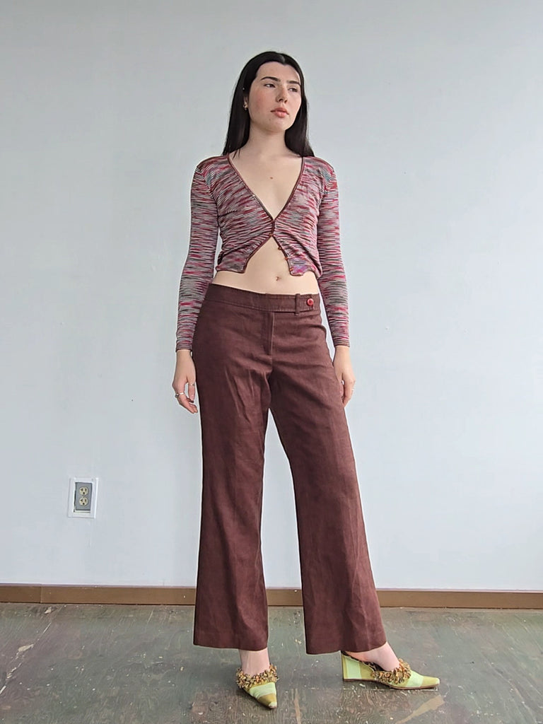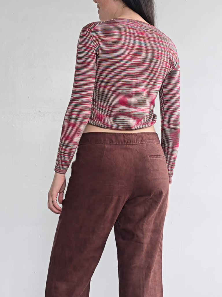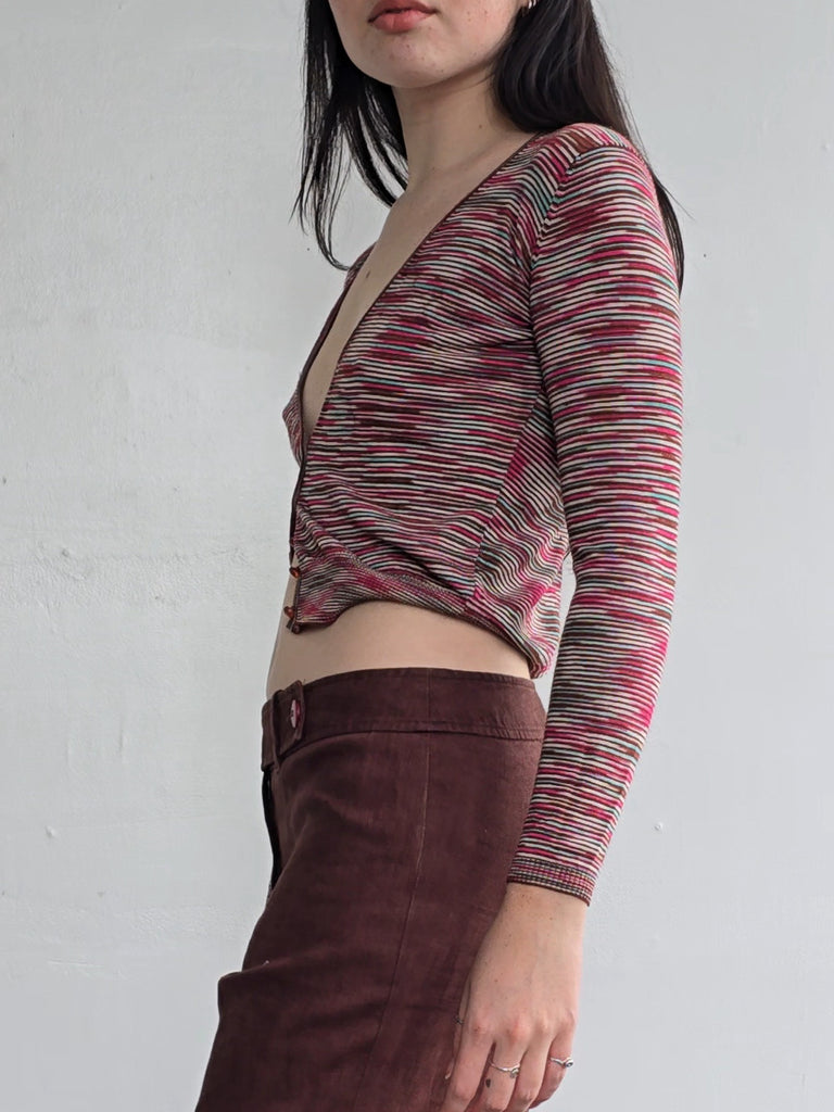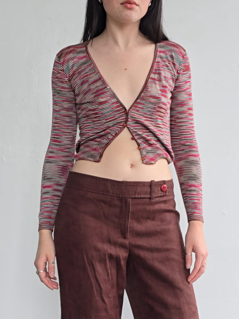 Italian-made Missoni colorful stripe cardigan with orange buttons. There is a slight stretch to the fabric. A couple of the buttonholes are a bit worn but otherwise in good condition.