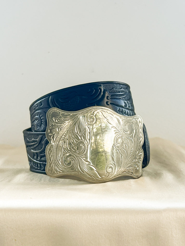 Vintage Black tooled leather belt with oversize silver-tone buckle. In great condition.