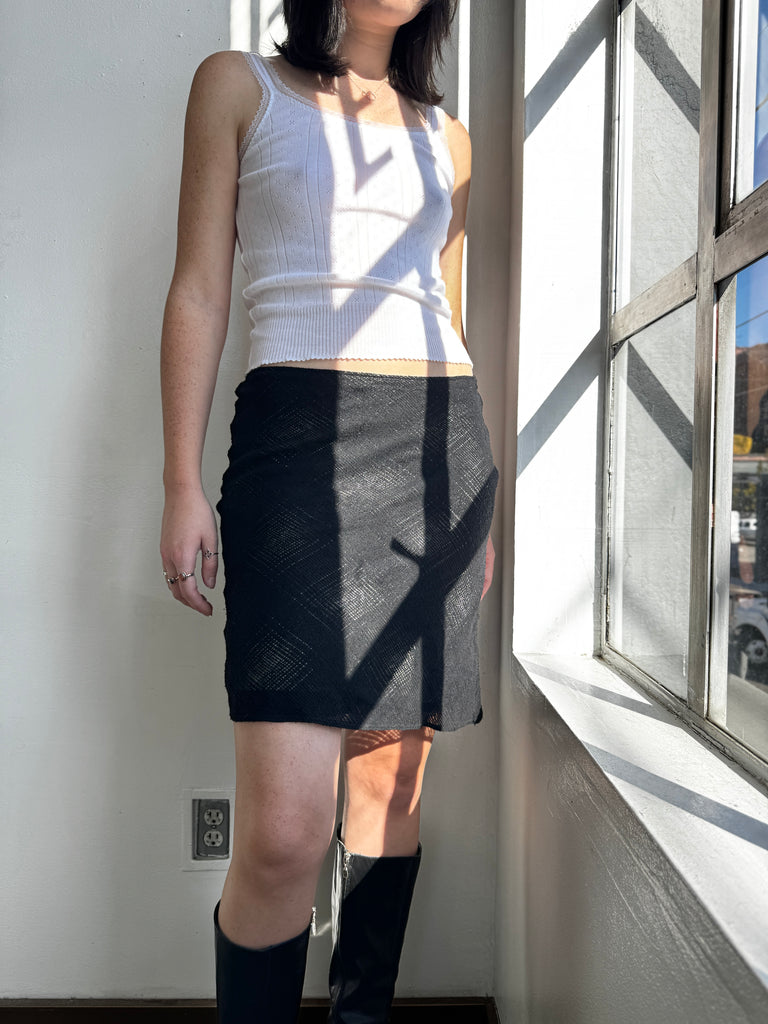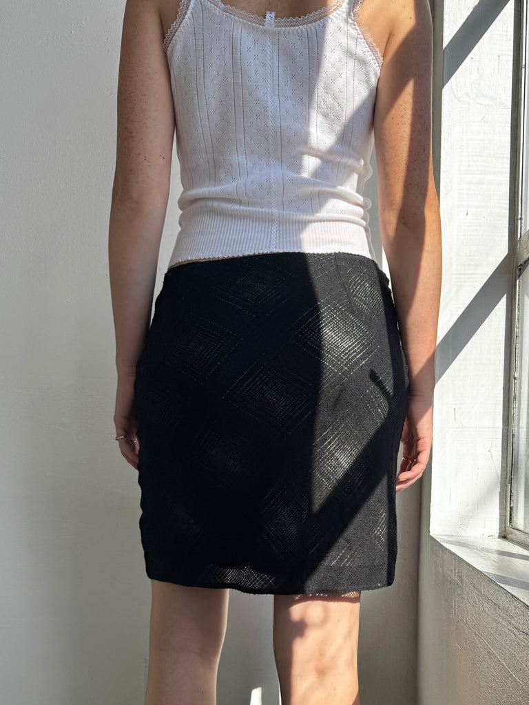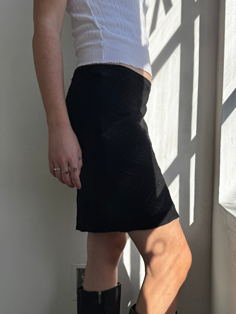 Vintage y2k low rise layered bias skirt. Black wool open weave layer over a contrast white lining with a side zip closure. In great condition.