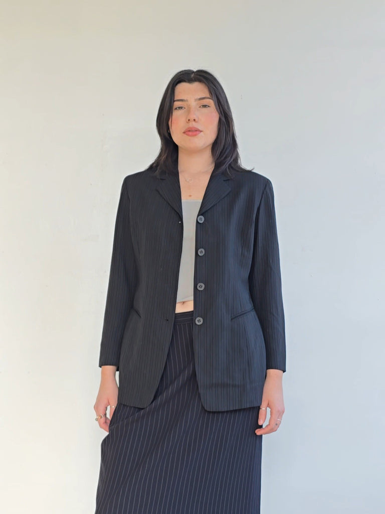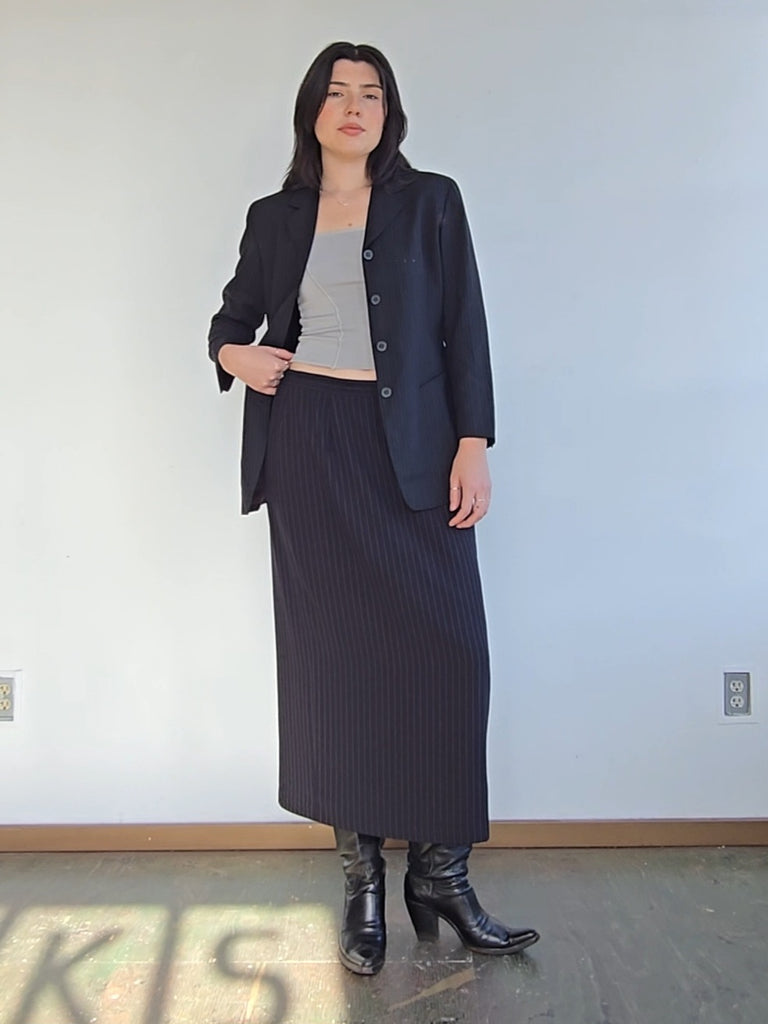 Vintage dark navy blue pinstriped skirt. Slinky fabric, lined. Zip closure, elastic at sides of waistband. Excellent condition. Marked vintage size 14.