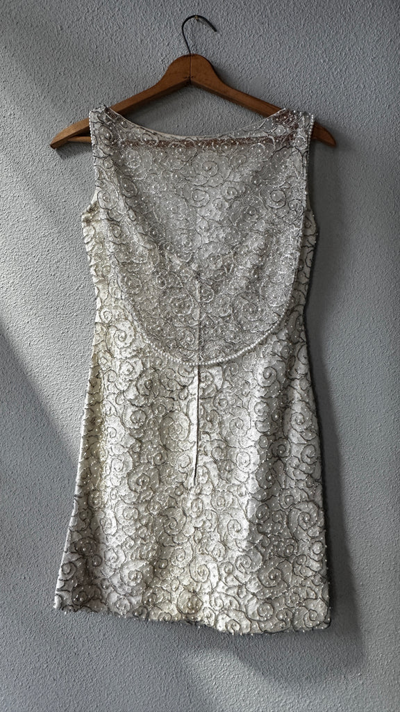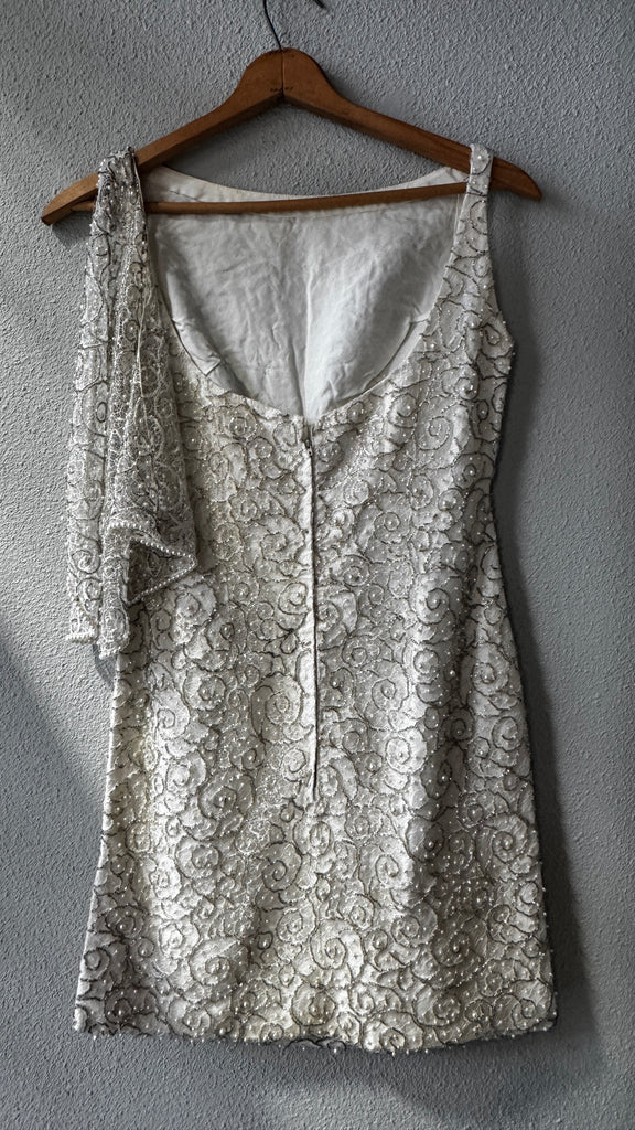 One of a kind vintage mid-century white beaded mini dress. Fitted shape with intricate metallic, pearl and glass beads. Center back metal zip closure with hook and a small sheer beaded caplet that drapes in back from the shoulder with a hook and eye. In great vintage condition with just a few loose beads.