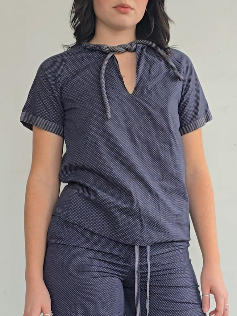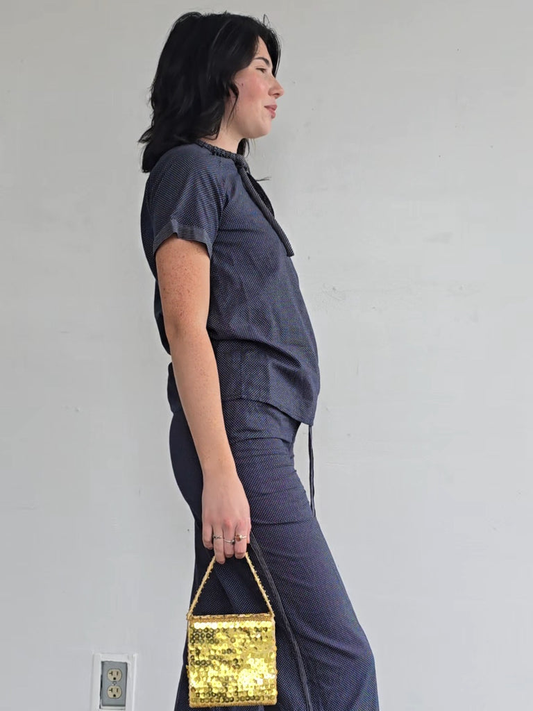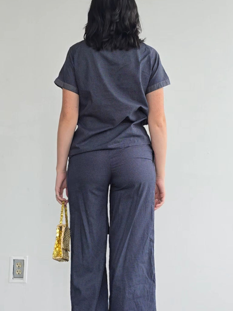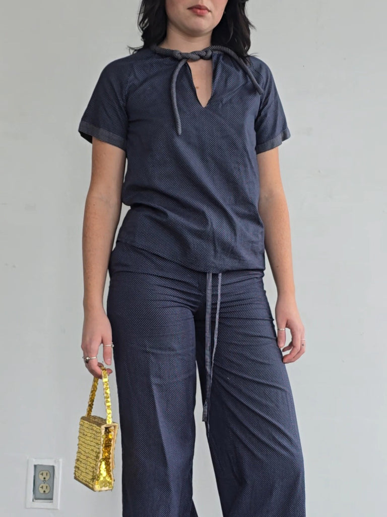 Vintage Beene Bag Geoffrey Beene cotton dotted set from 1980s. Super cute and made from lighter weight woven cotton. Pants have zip closure. Marked vintage size 8 (fits like modern small). Slight yellowing around collar, good vintage condition for age.