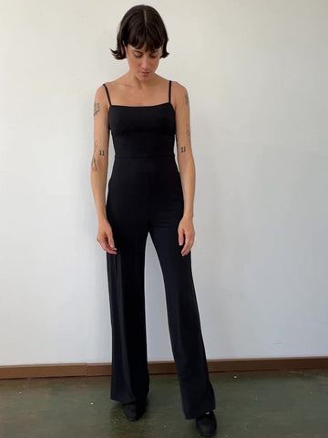 Vintage slinky black jumpsuit. Made in France by luxury label Eres. Black stretchy fabric with wide legs and a square cut neckline with spaghetti straps and pockets, pull on style without fastening. In excellent condition with tag attached.