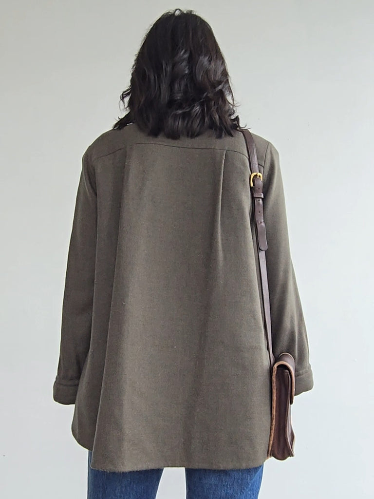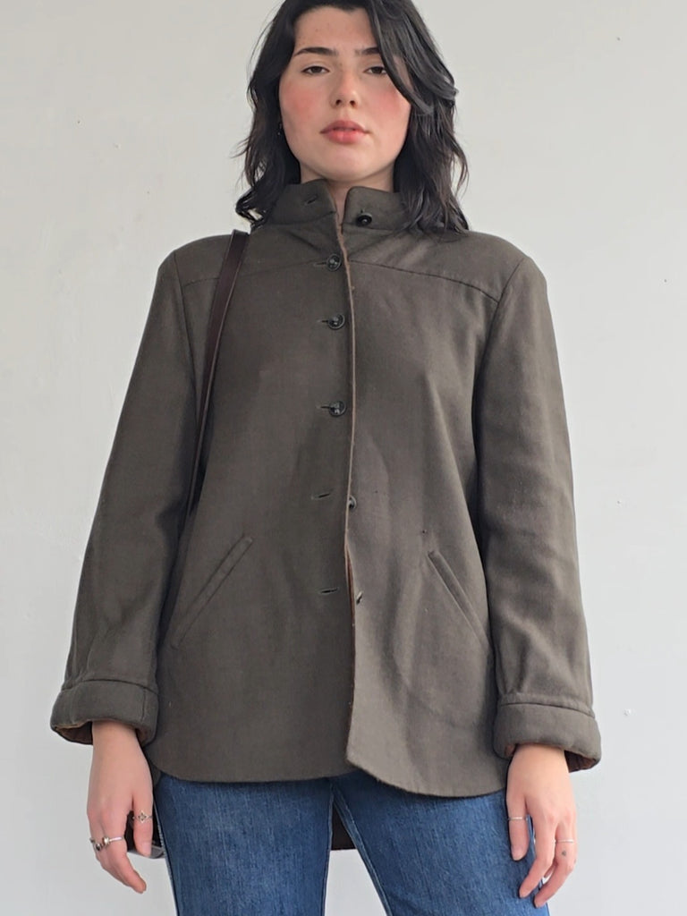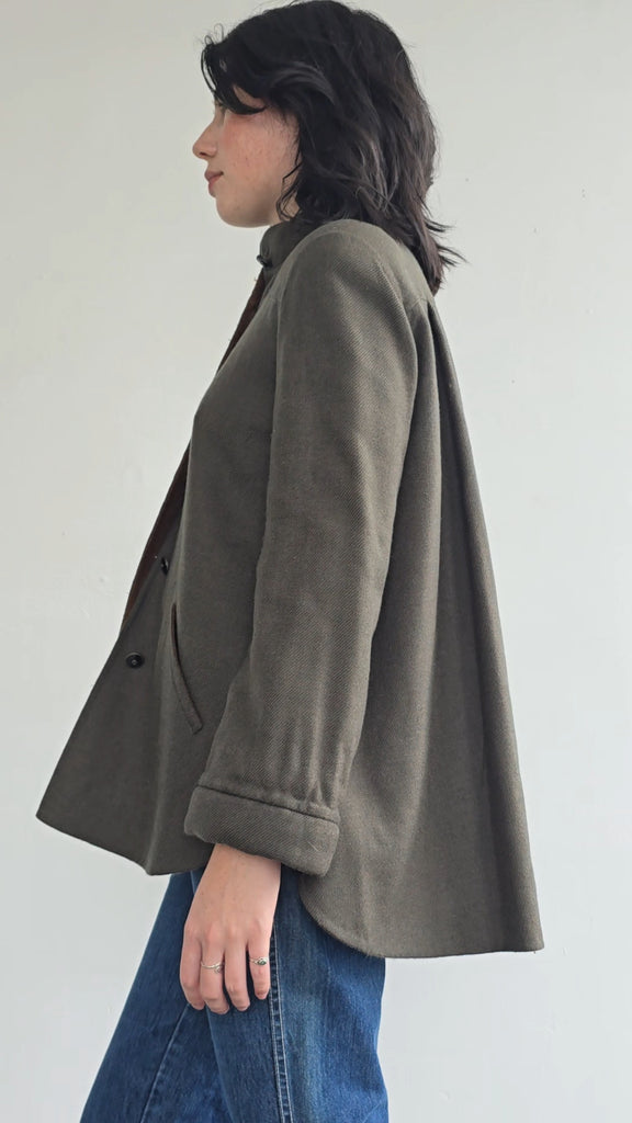 Vintage Geoffrey Beene woven jacket in moss green with amber interior. Double woven layer allowing the interior woven color. Lovely shaping of jacket. Two front pockets, buttonfront closure. Some wear and pilling on interior and exterior. Good condition for age.