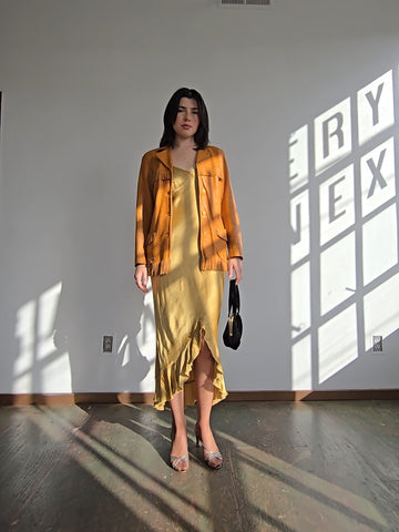 Vintage 1950s/60s softest amber leather fringed jacket with two front pockets. Lined. Missing belt but has belt loops. Great vintage condition.