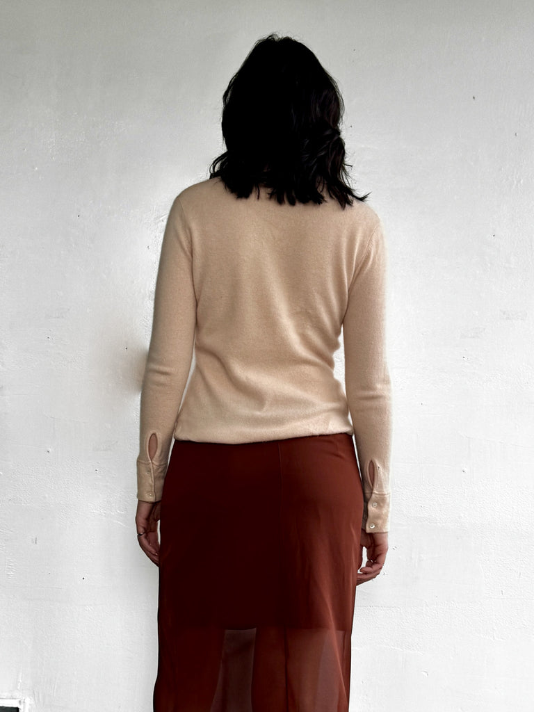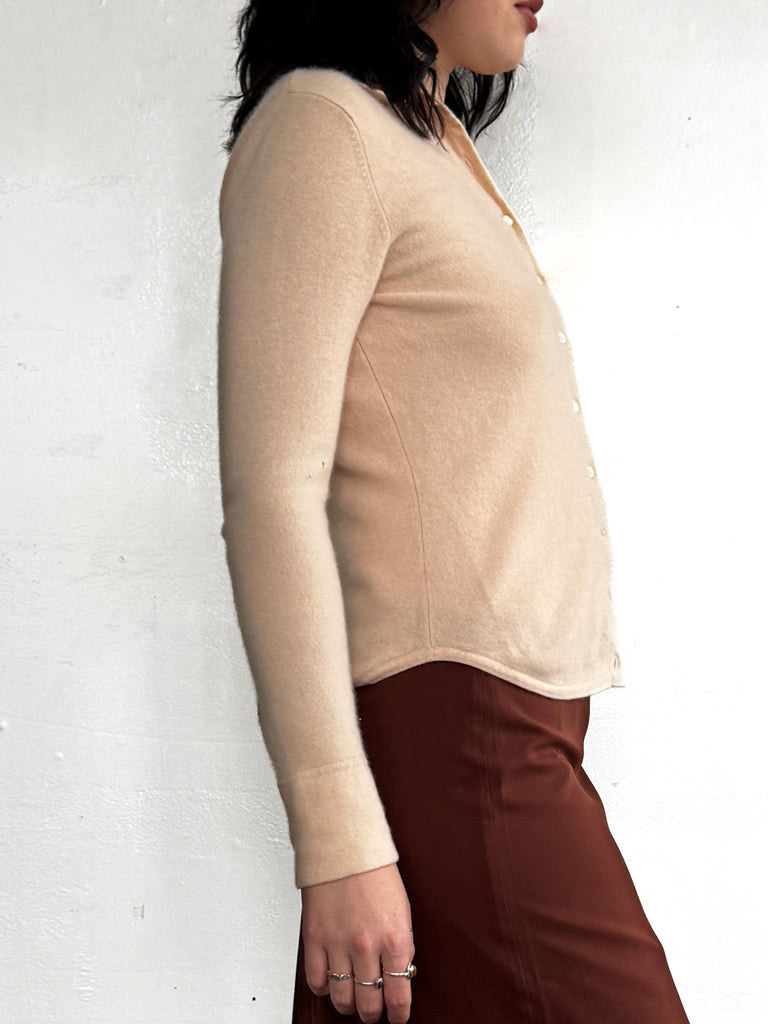 Beautiful 90s cashmere button front cardigan with a polo collar. Soft pale pink with button closures at the cuffs. In good condition overall with a small repair.