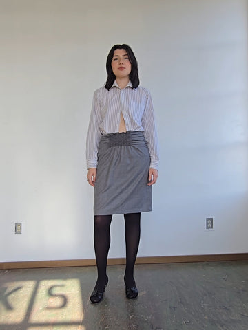 Vintage Rene Lezard woven gray skirt with ruched fabric detailing at waistband. Lined, back zip closure. Marked size 36.