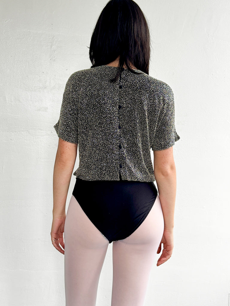 Vintage 90s silver beaded black silk crew neck bodysuit. Button closure at the back, with short sleeves and black spandex brief attached with snap closure. In excellent condition.