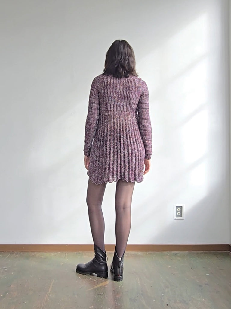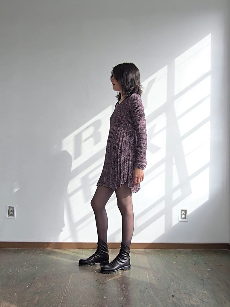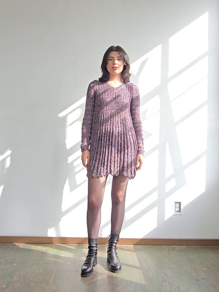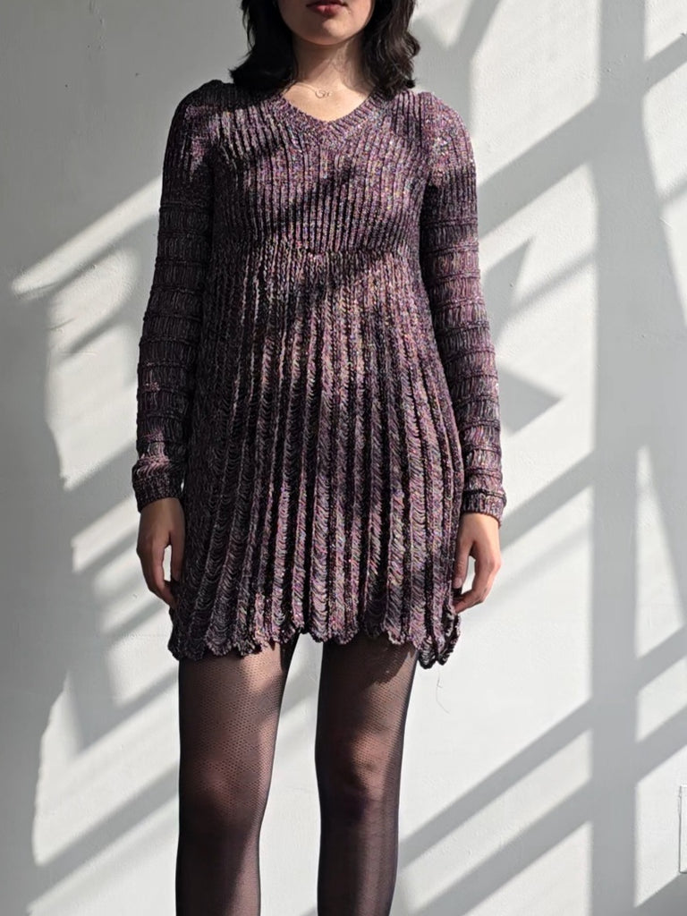 Chloe purple metallic knit dress with long sleeves and a V-neckline. There are a few frayed threads throughout the skirt but otherwise in great condition. Made in Italy. Marked sz M.