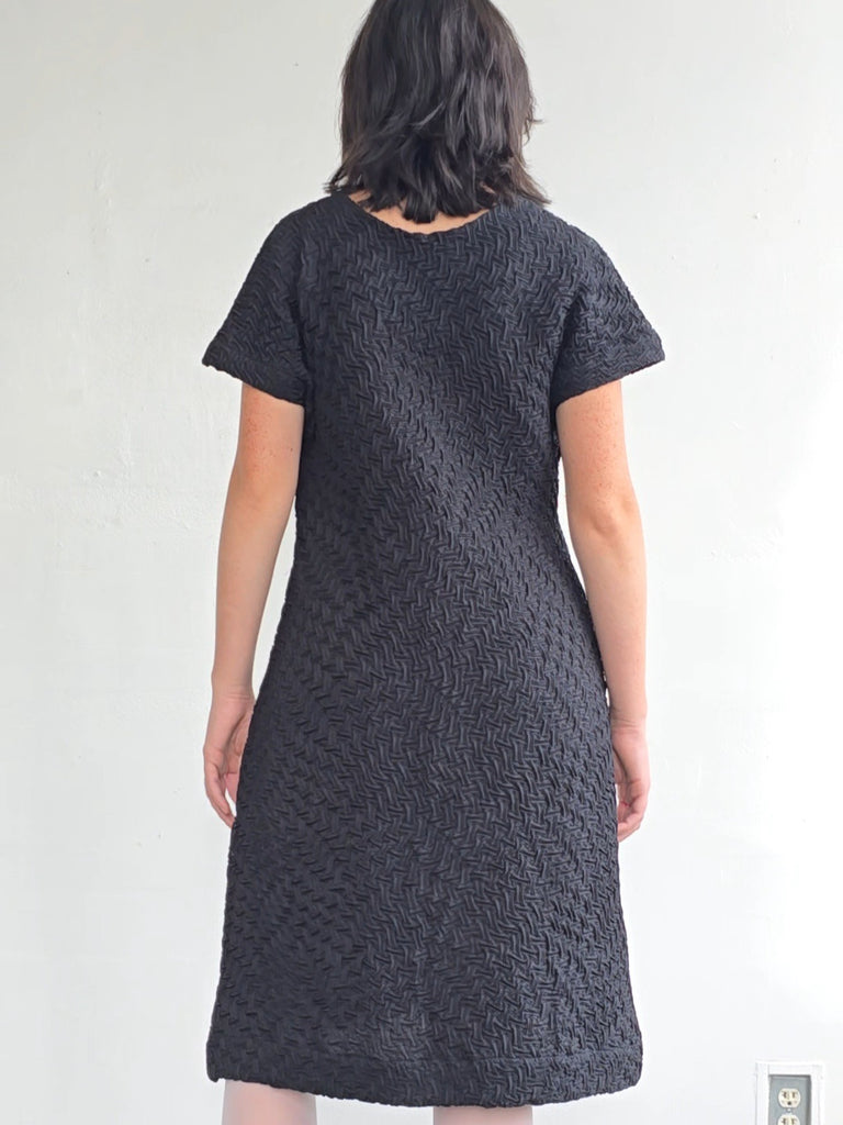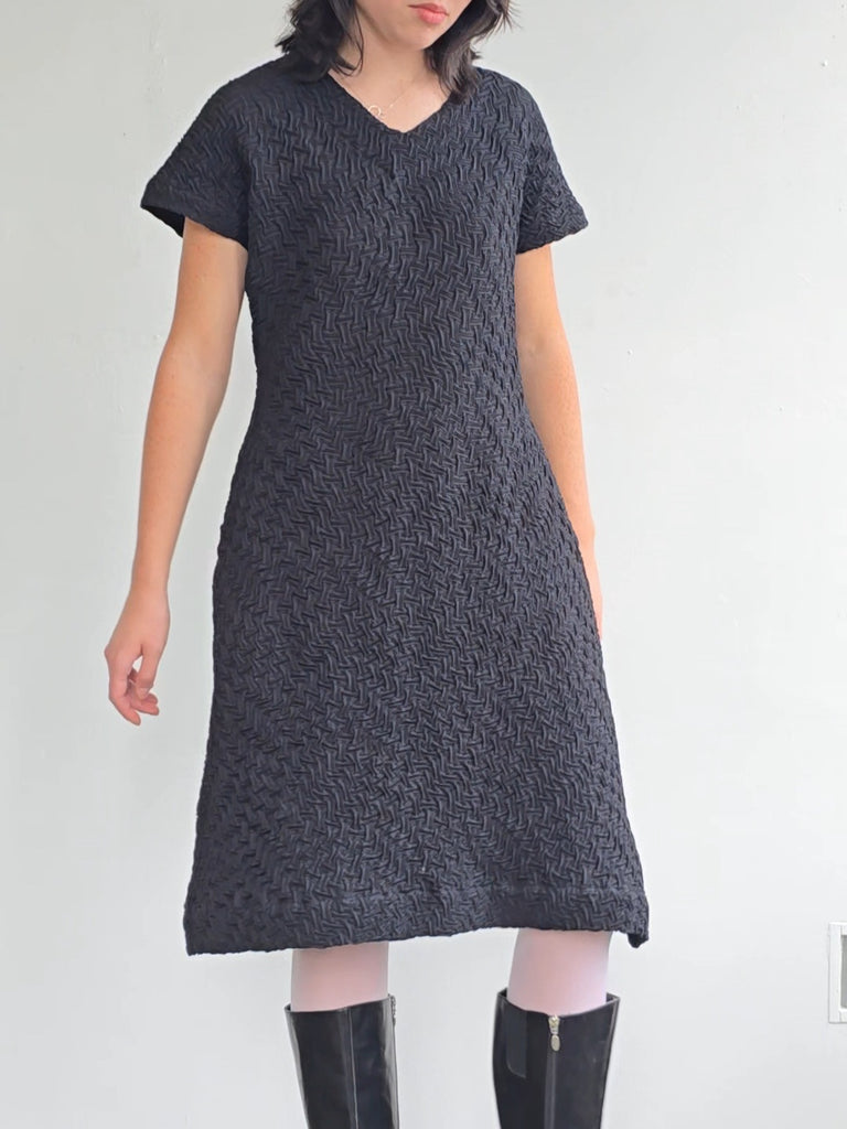 Issey Miyake black sculptural textured dress with a V-neckline and pockets on the sides. In great condition. Marked sz 3.