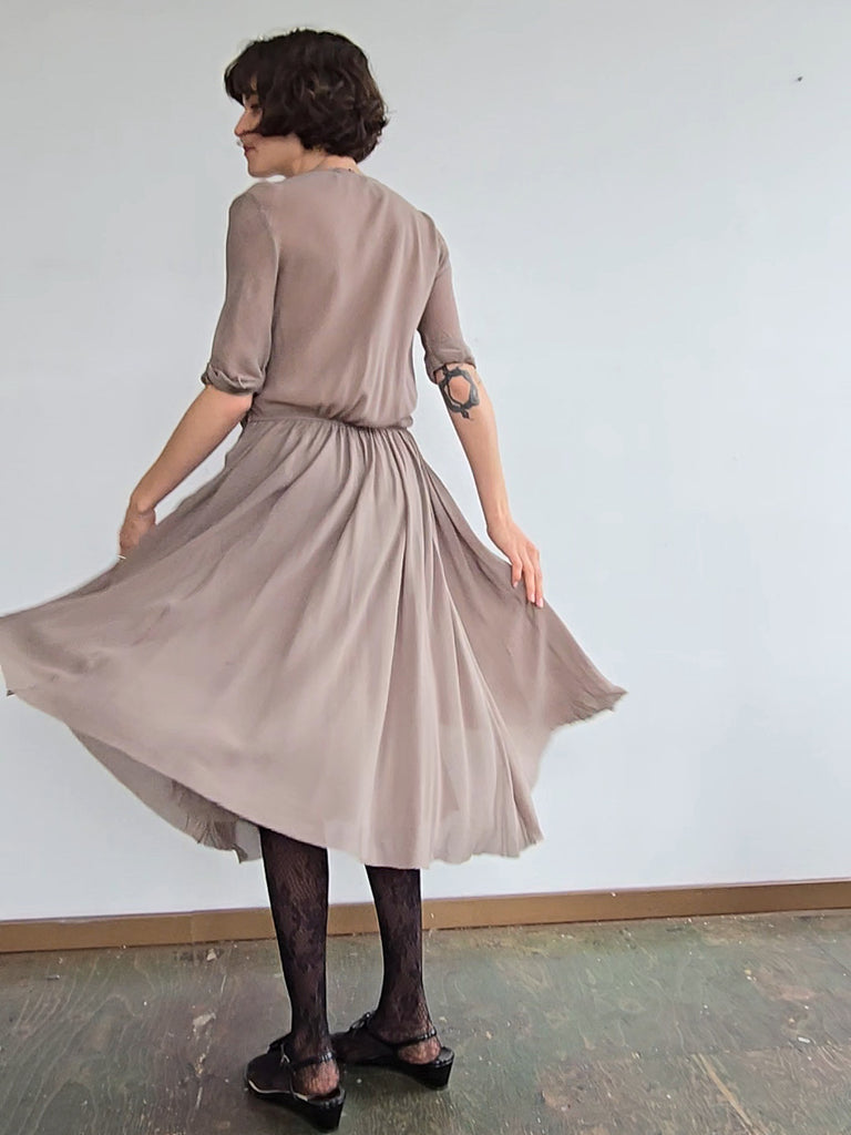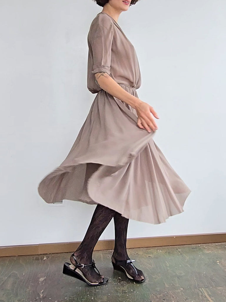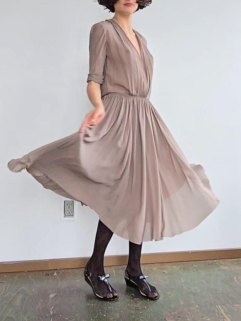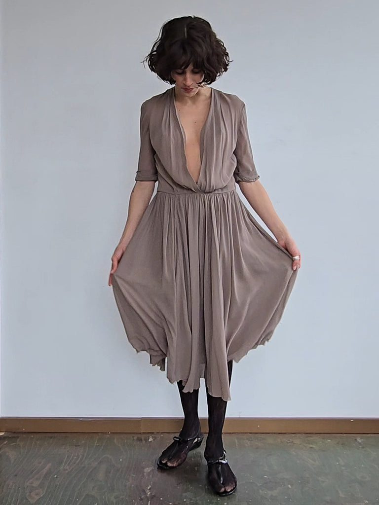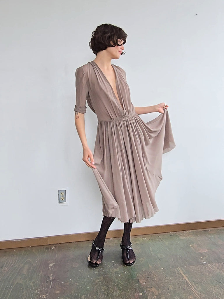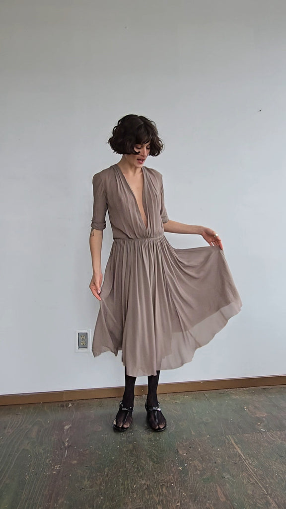 Silk dress with silk lining. Raw hem with a plunging neckline. Light and breezey. A few minor marks of discoloration.