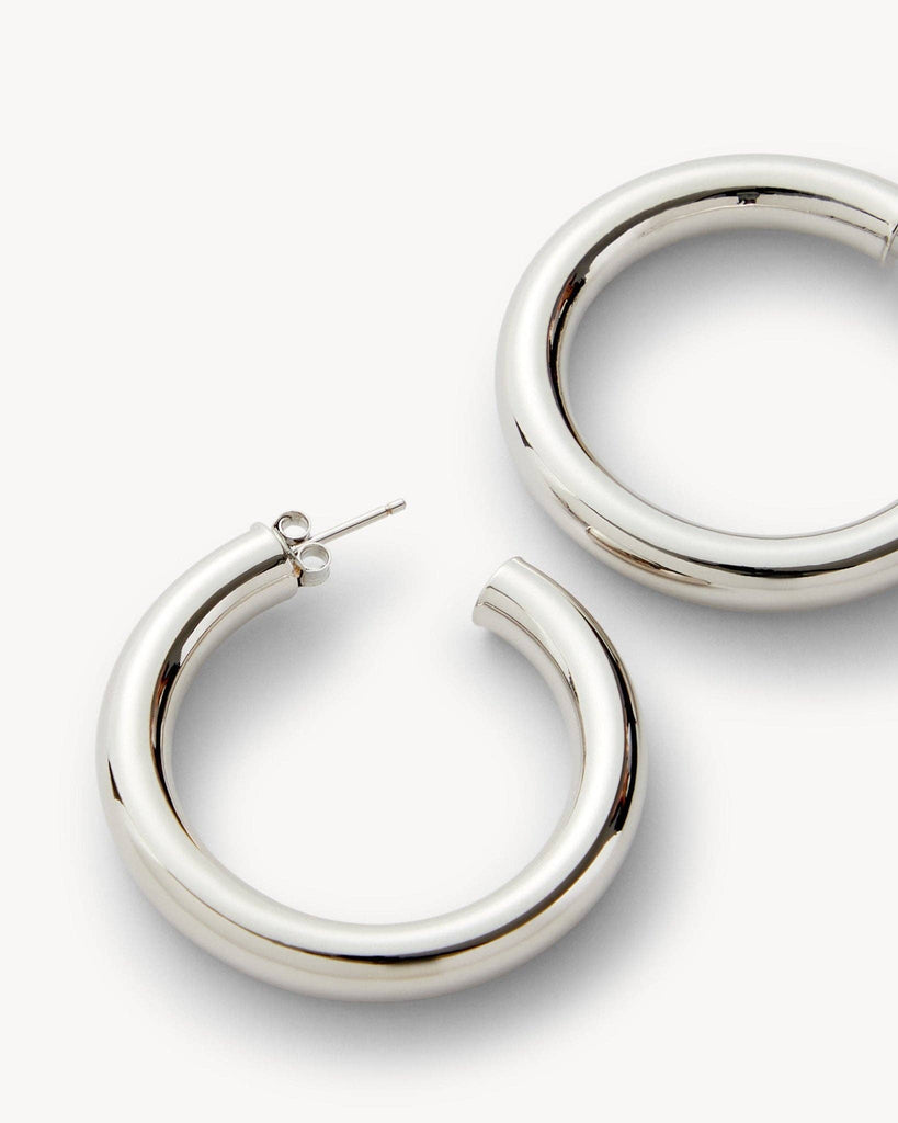 Large, lightweight hoops with engraved butterfly backings. Measuring at 1.5” in diameter and 5mm thick, these silver hoop earrings are made from recycled brass and rhodium plating with a silver post. They are designed to be an evergreen staple in your repertoire. And, it’s a good thing they’re made to last, because silver hoop earrings match pretty much anything! Wear them on their own for a simple, understated look, or layer multiple earrings for a more curated style.