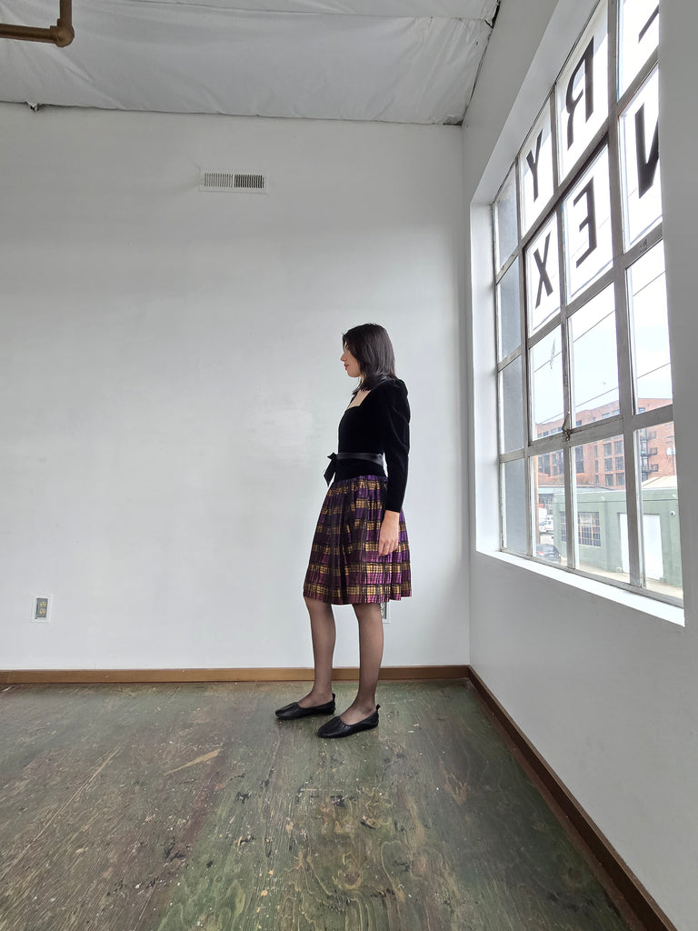 Incredible made in France Guy Laroche 1980s shaped velvet bodice dress with taffeta metallic patterned skirt. Lovely for the holidays and beyond! Marked French size 38, excellent vintage condition.
