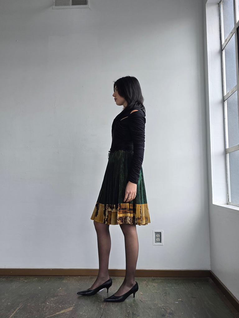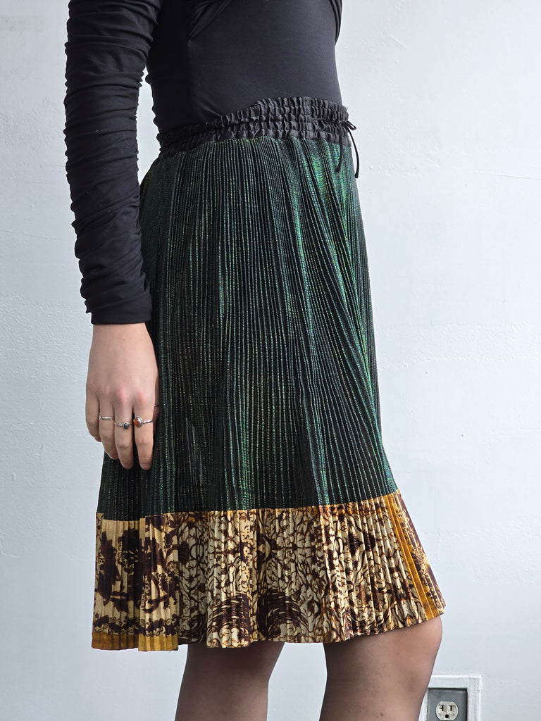 Incredible 100% silk Jean Paul Gaultier Femme pleated metallic skirt with contrasting earth toned pleated hem. Excellent condition, marked size 6.