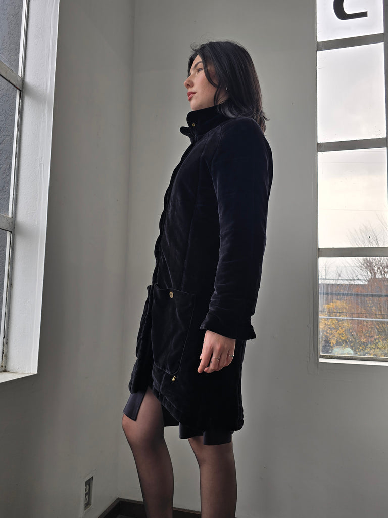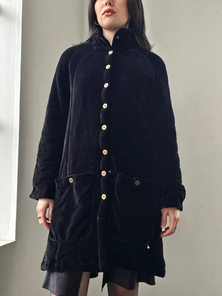 Stunning vintage made in France Sonia Rykiel black velvet coat with bronze logo snap buttons. Cushy and warm quilting with satin lined interior. Two front snap pockets, marked size L. Excellent condition.