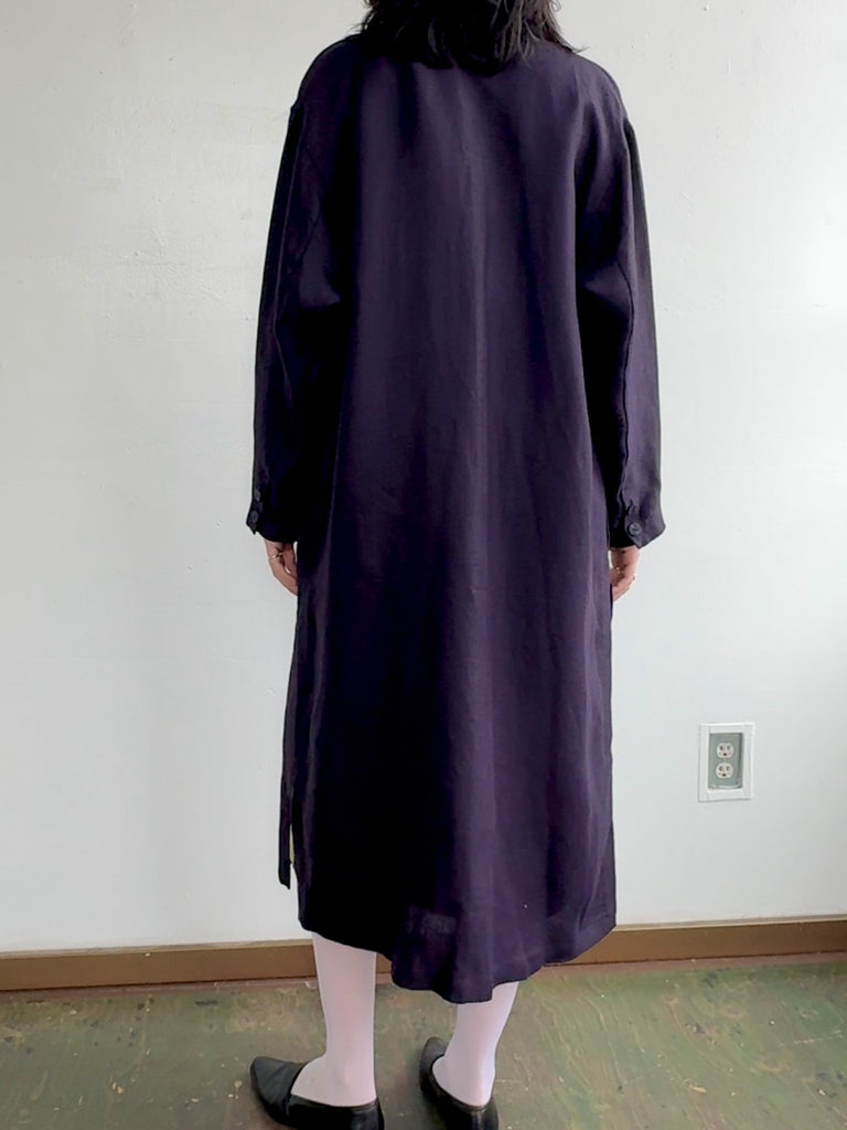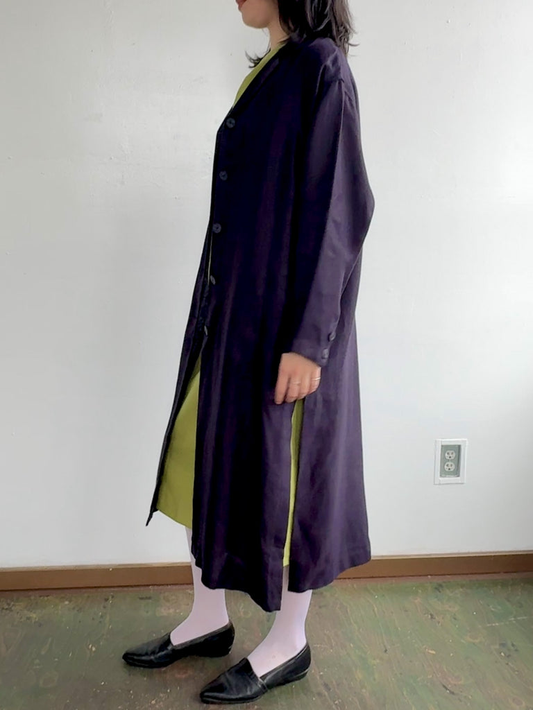 Incredible Vintage Kenzo Paris minimal navy linen duster. Elegant shape with a classic collar, five button front closure, two side pockets, and extended side slits. In excellent condition.