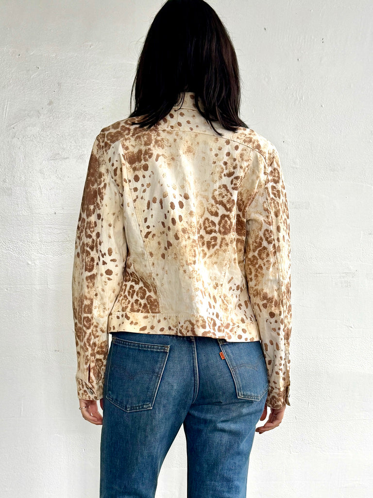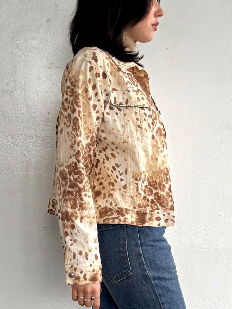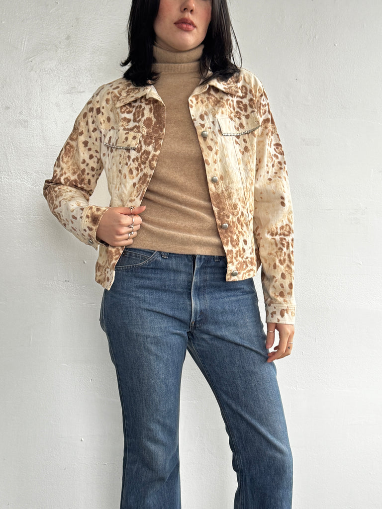 Cute vintage leopard print trucker jacket. Lightweight cotton blend, with button front and silver stud embellishment at collar and rhinestone trim details along the chest pockets. In excellent condition.