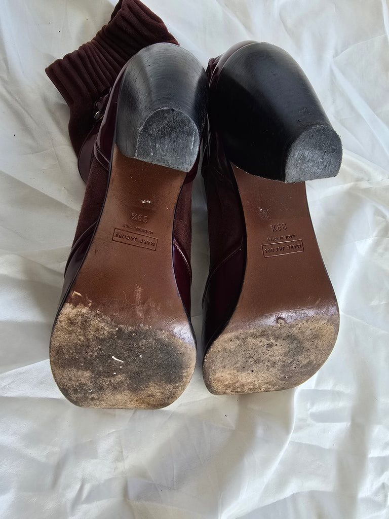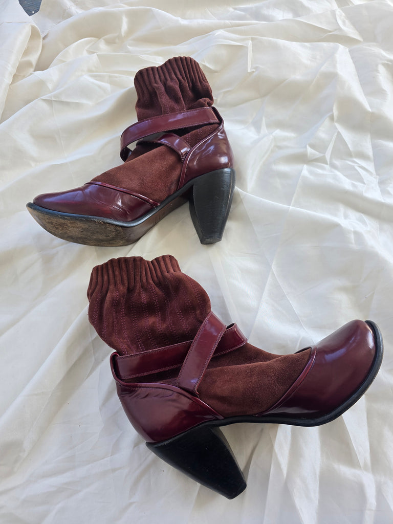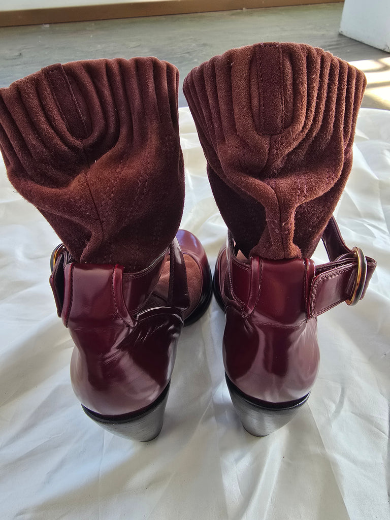Vintage Y2K Marc Jacobs really cool boots in burgundy suede and patent leather. Great vintage condition. Marked size 39.5, 3.5 inch heel.