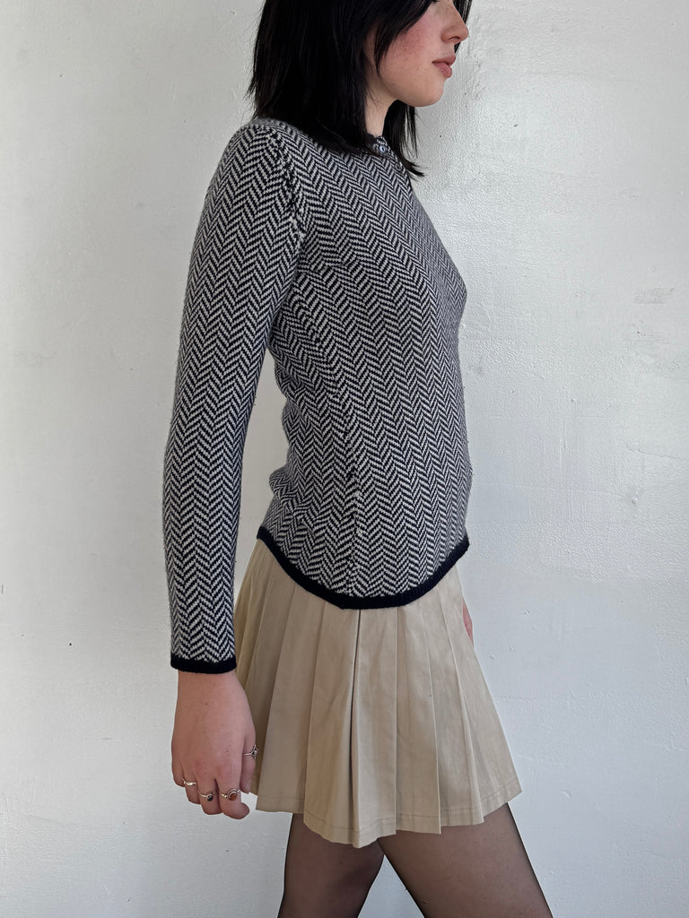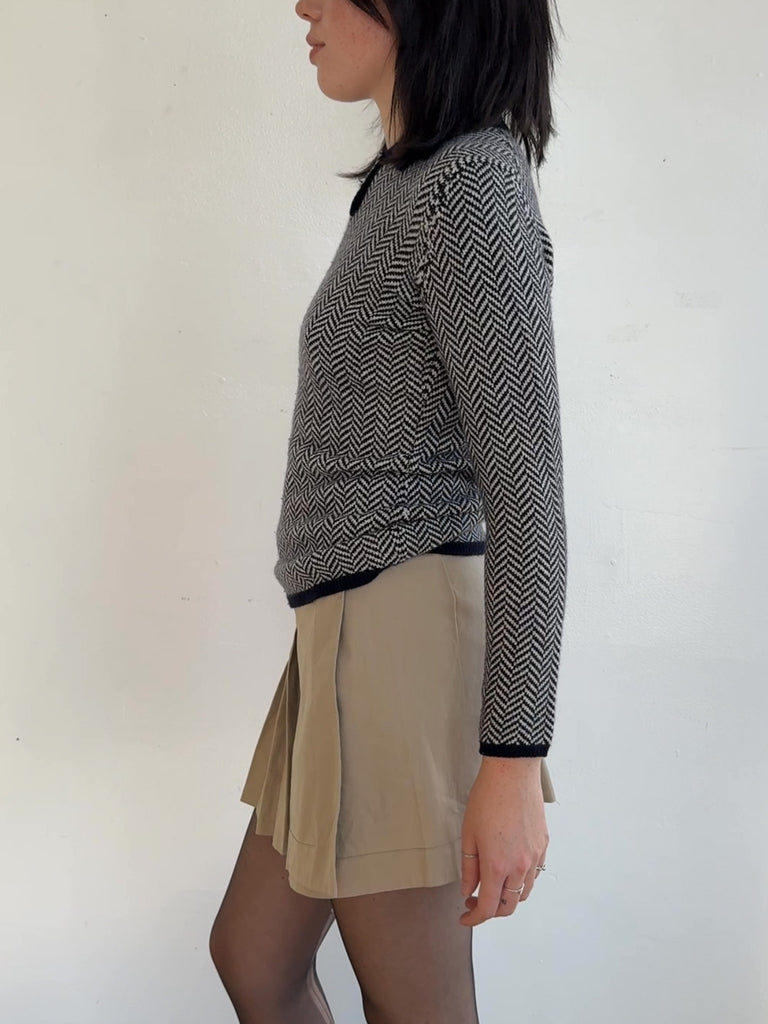 90s Saks Fifth Avenue black and white herringbone print cashmere sweater. Polo style collar with 2 buttons. In excellent condition.