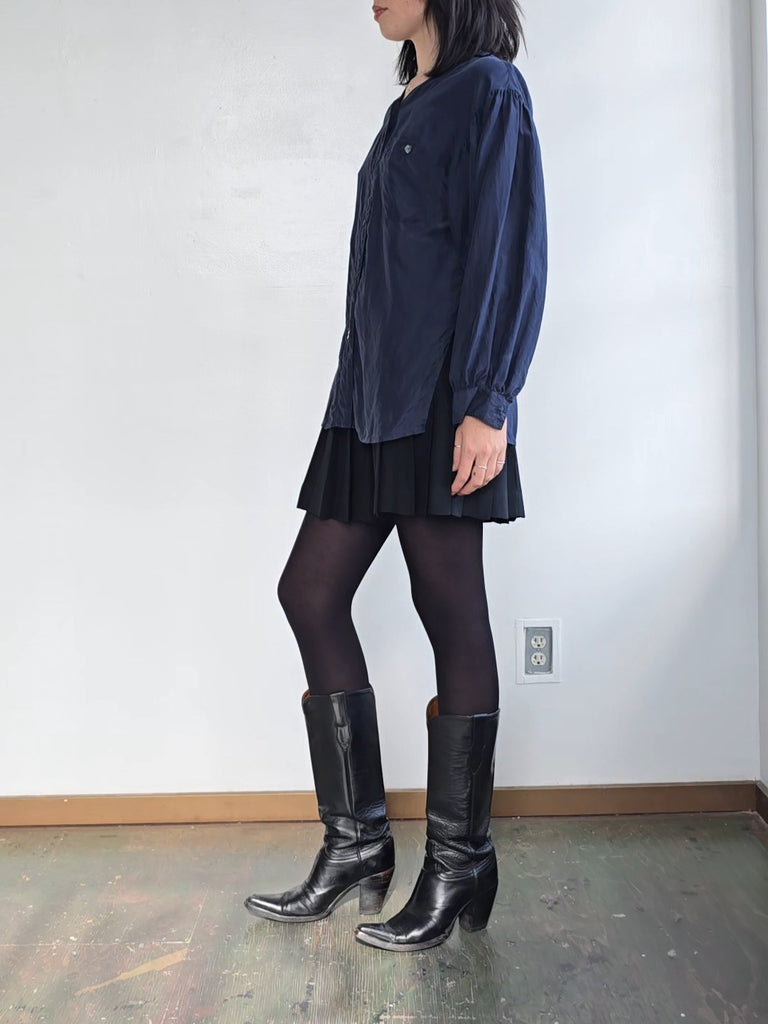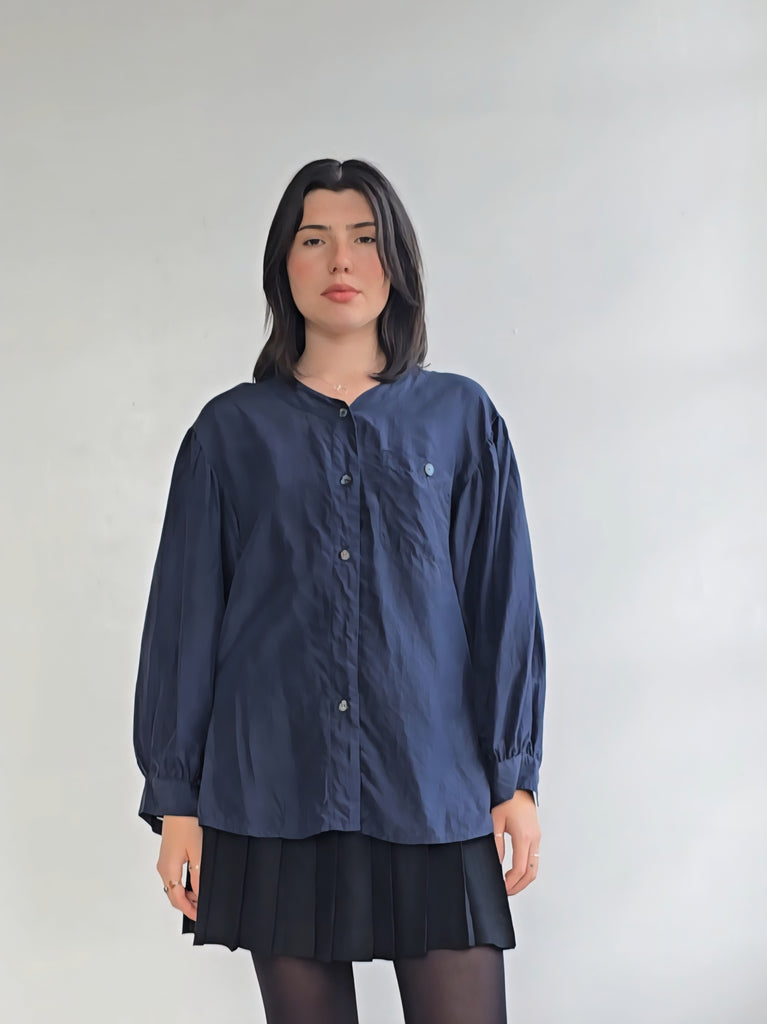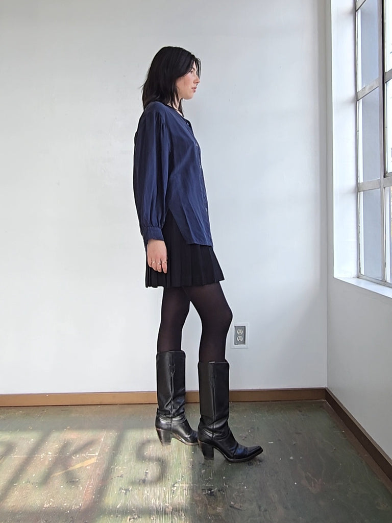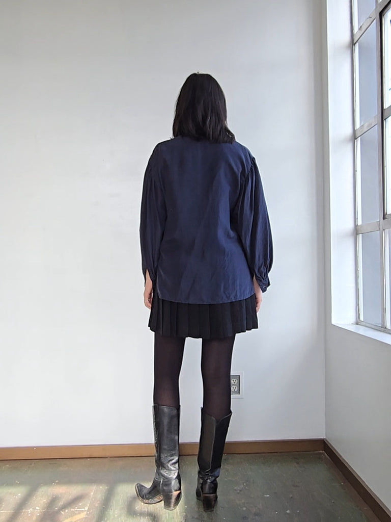 Vintage navy blue silk blouse with slightly dropped shoulders and full sleeves. Excellent condition.