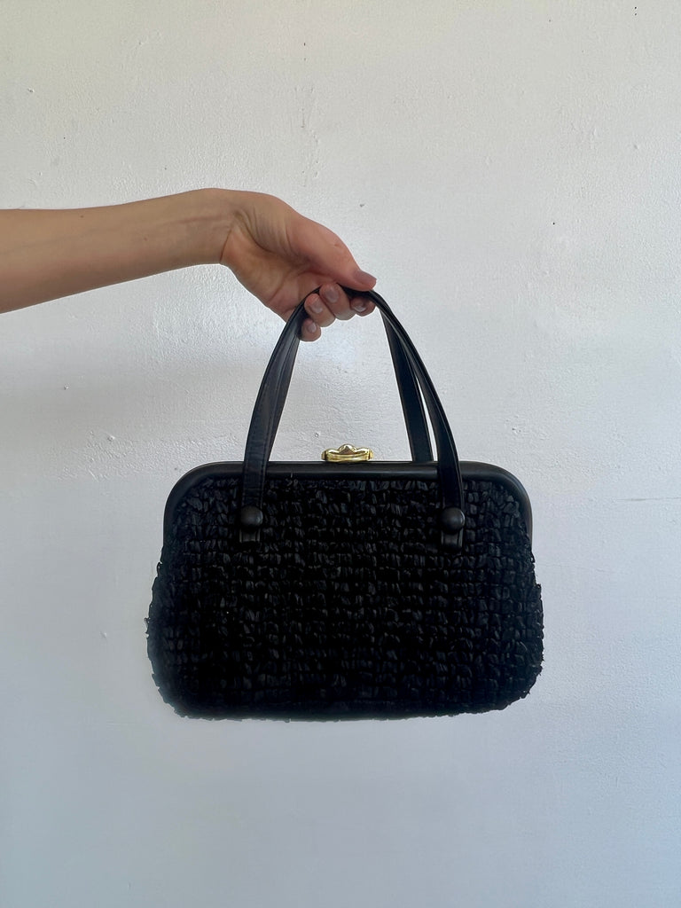 Vintage woven basket handbag with a double top strap. Clasp closure with interior zipper pockets.