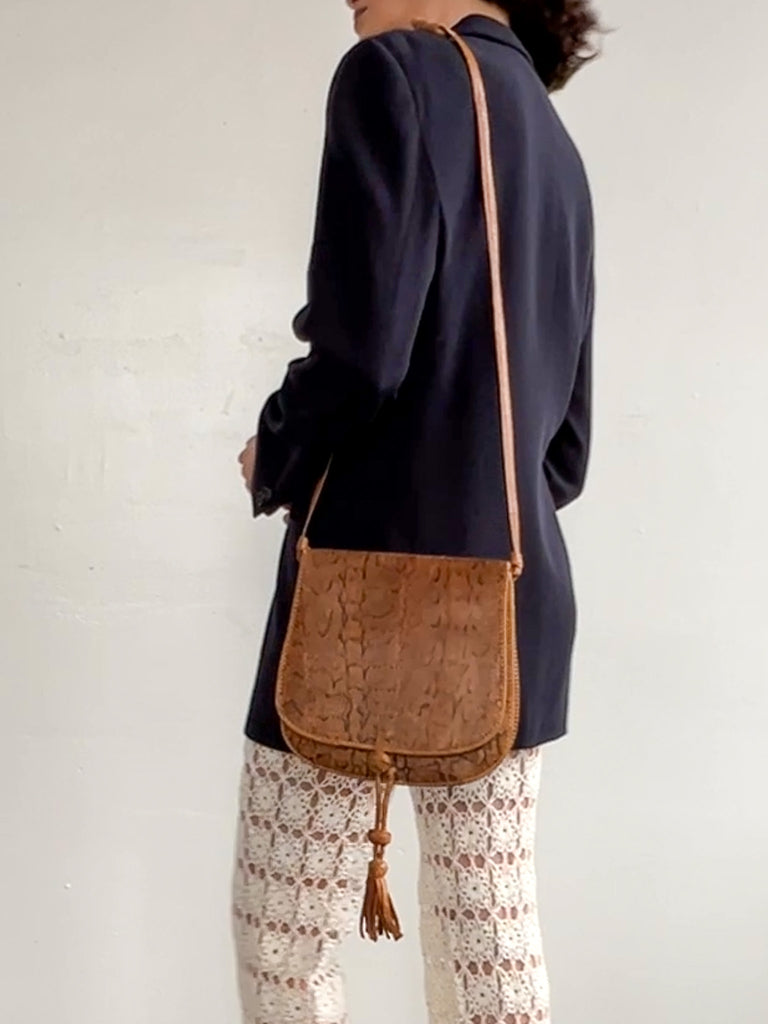 Rustic tan and black 70s snakeskin cross body saddle bag with magnetic clasp. Lightweight with interior pockets. In great vintage shape.