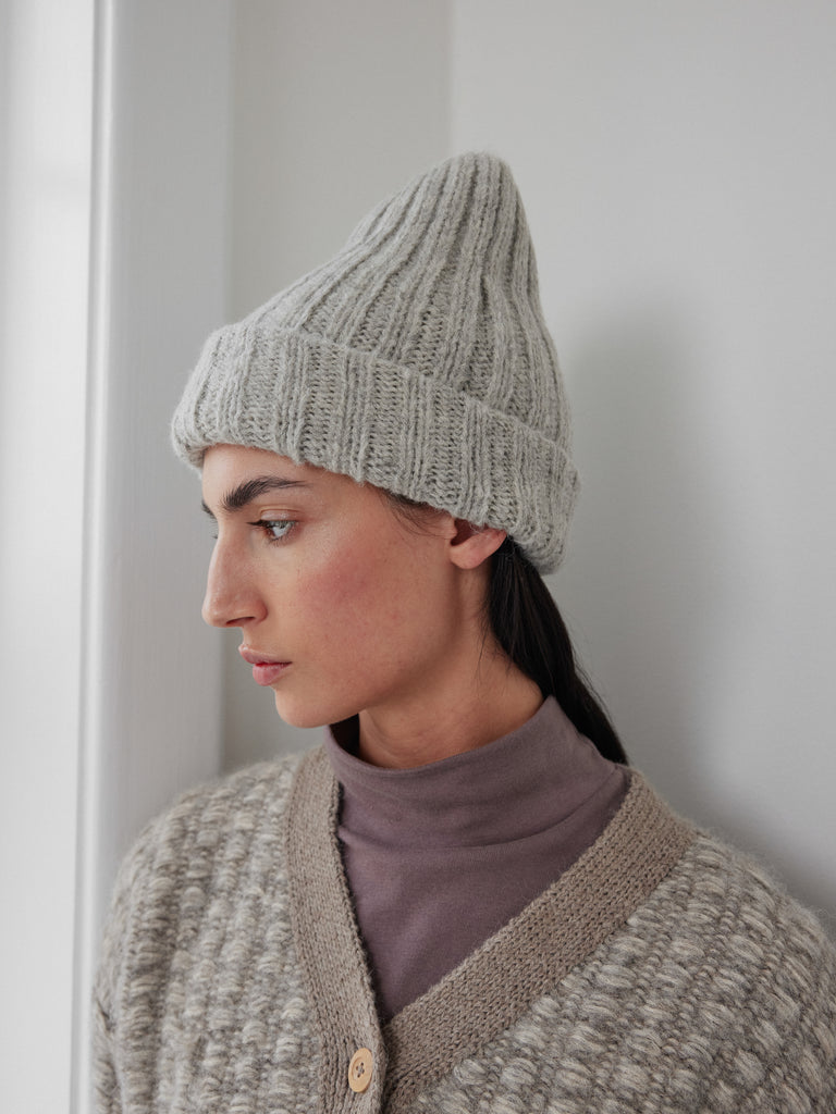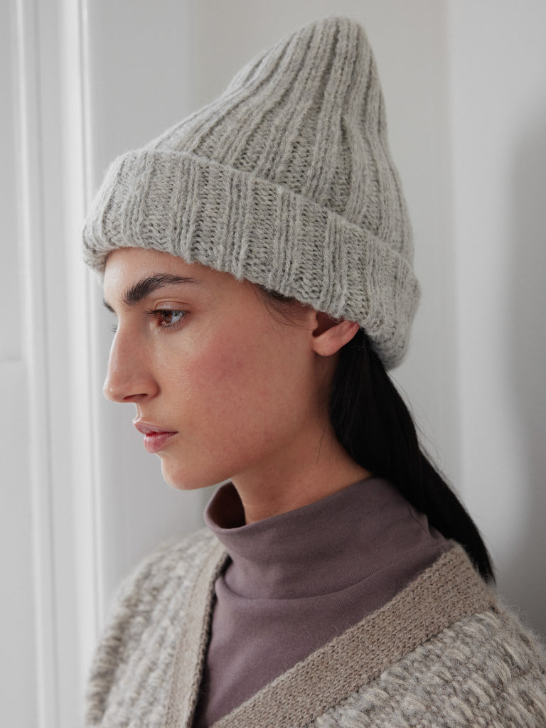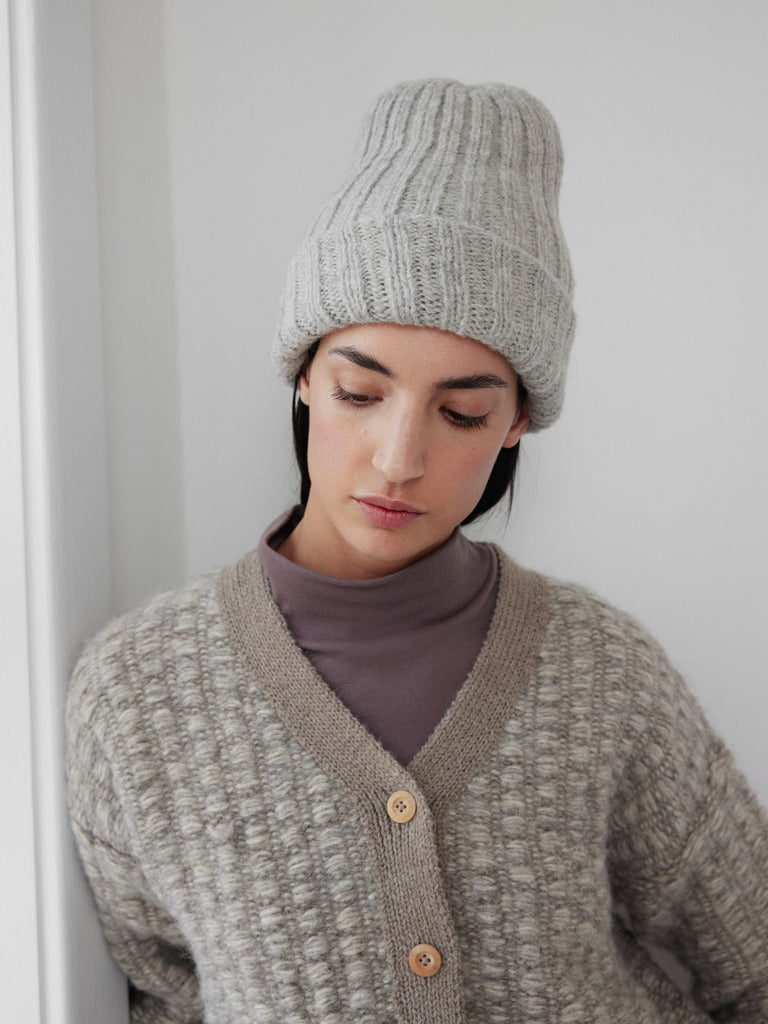 Double layer rib beanie, long enough for a generous foldover cuff making it extra warm around the ears. Knit in a 100% brushed alpaca yarn which makes it lofty, fuzzy, and super warm.