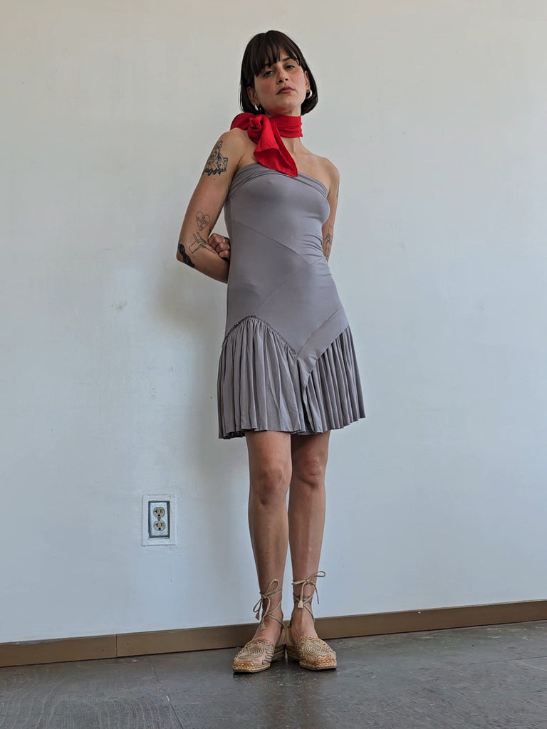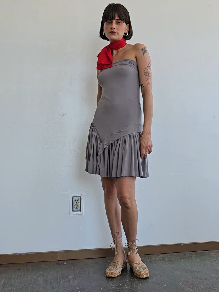The Lucile Mini is a mini strapless dress featuring asymmetric seams, ruffle-edged detailing, and gathered skirt.