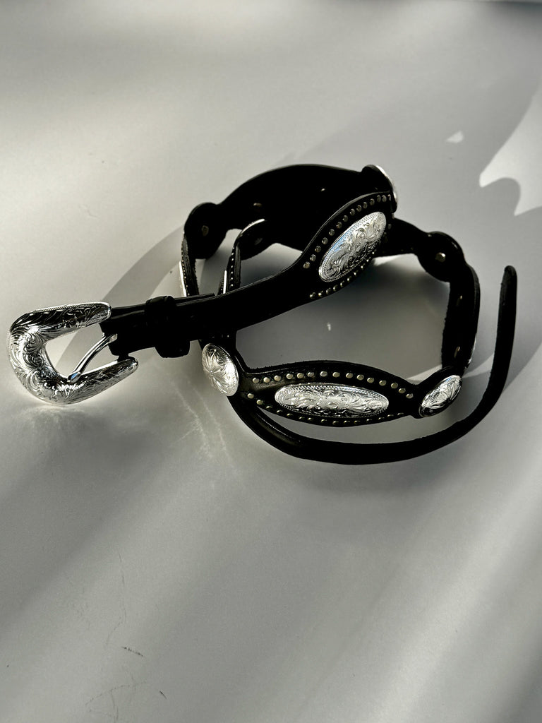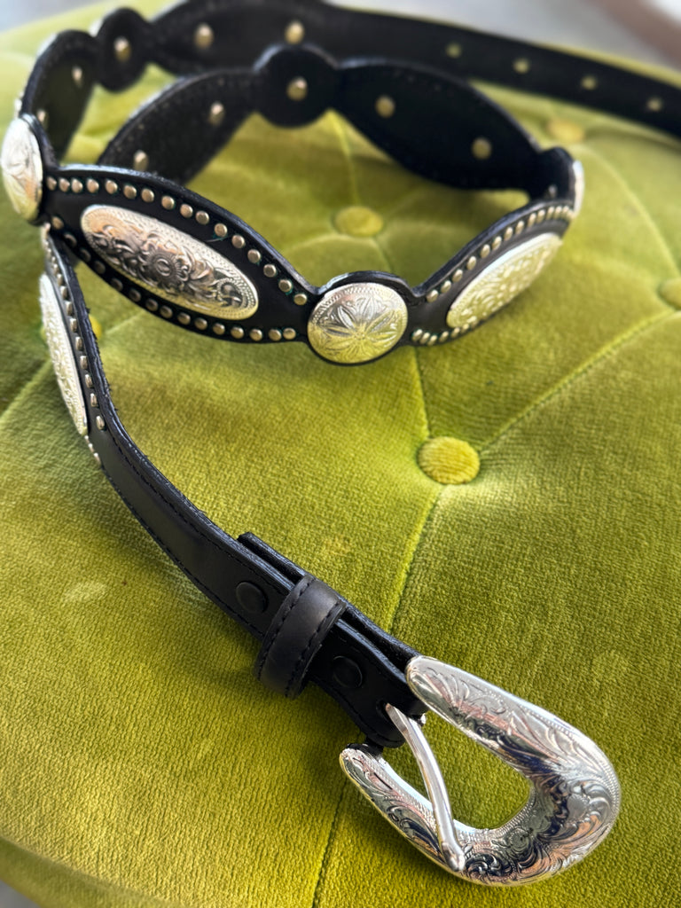 Nice scalloped leather belt adorned with silver tone round and oval engraved 'conchos' and studs with shiny silver western engraved buckle. In excellent condition.