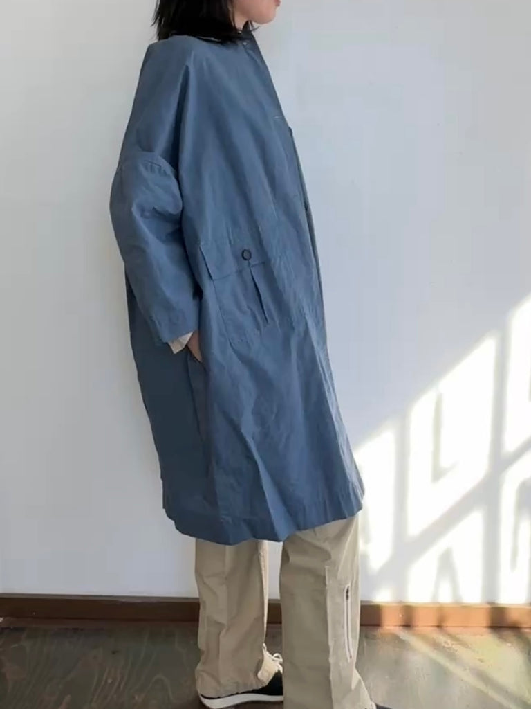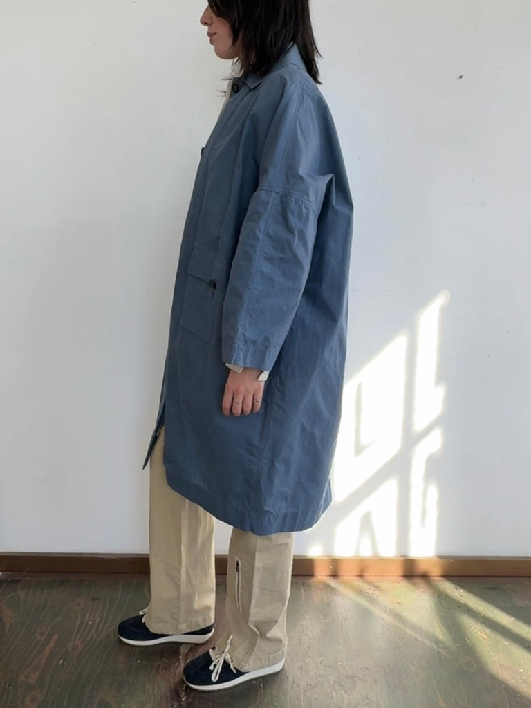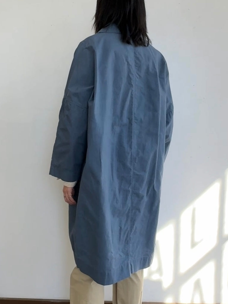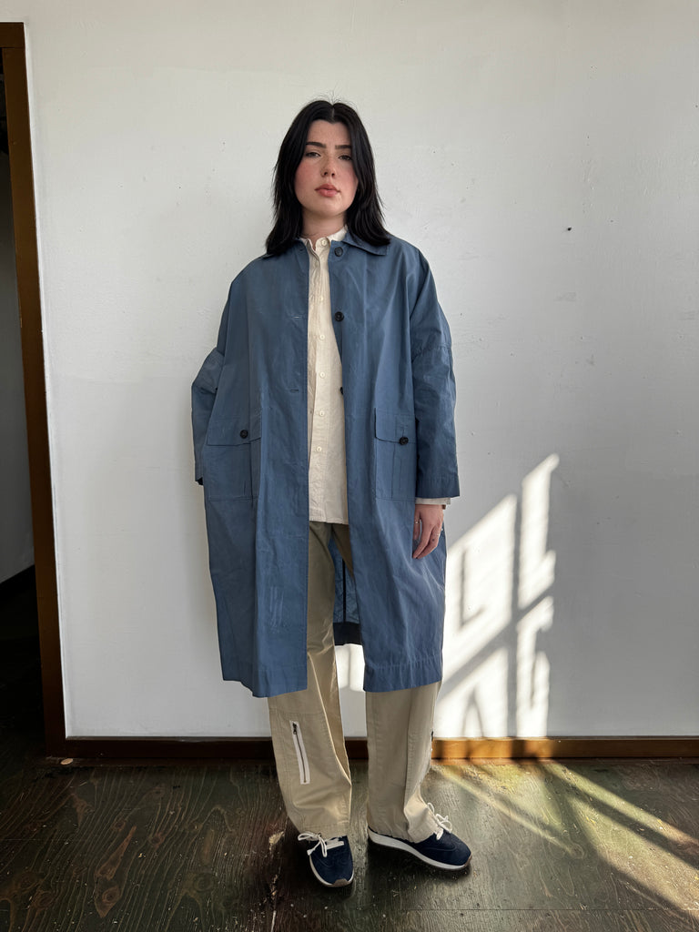 Amazing Cawley Studios blue waxed cotton trench. Oversized shape with dropped shoulder, wears well over chunky knits and layers, year round. Crafted in british waxed cotton that ages beautifully and has shoerproof properties. Features pointed collar, front patch pockets with button closure and two side seam pockets. In great condition. Made in London. Marked size M