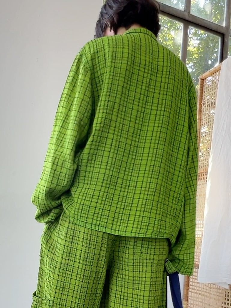 A very textured dinner jacket. Slinky, breathable, unstructured with a soft shoulder. Almost like a checkerboard seersucker.