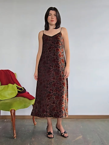 Gorgeous 1990s silk velvet autumnal dress with rose pattern. Excellent condition, marked size small.