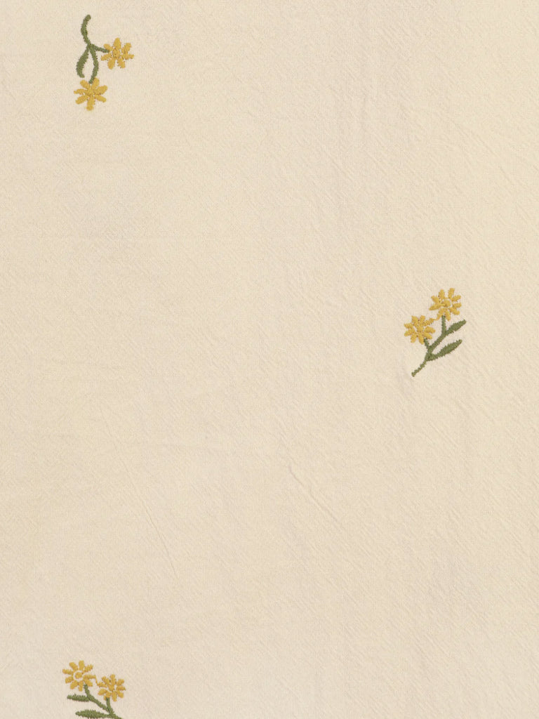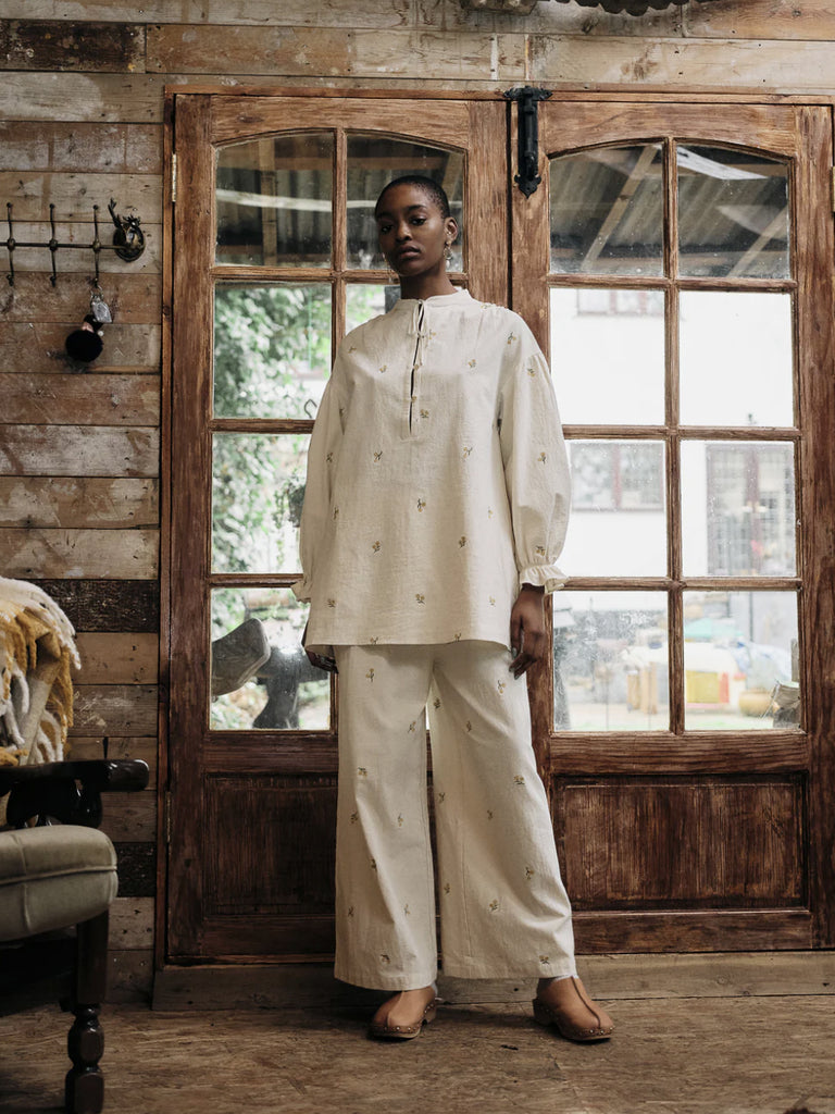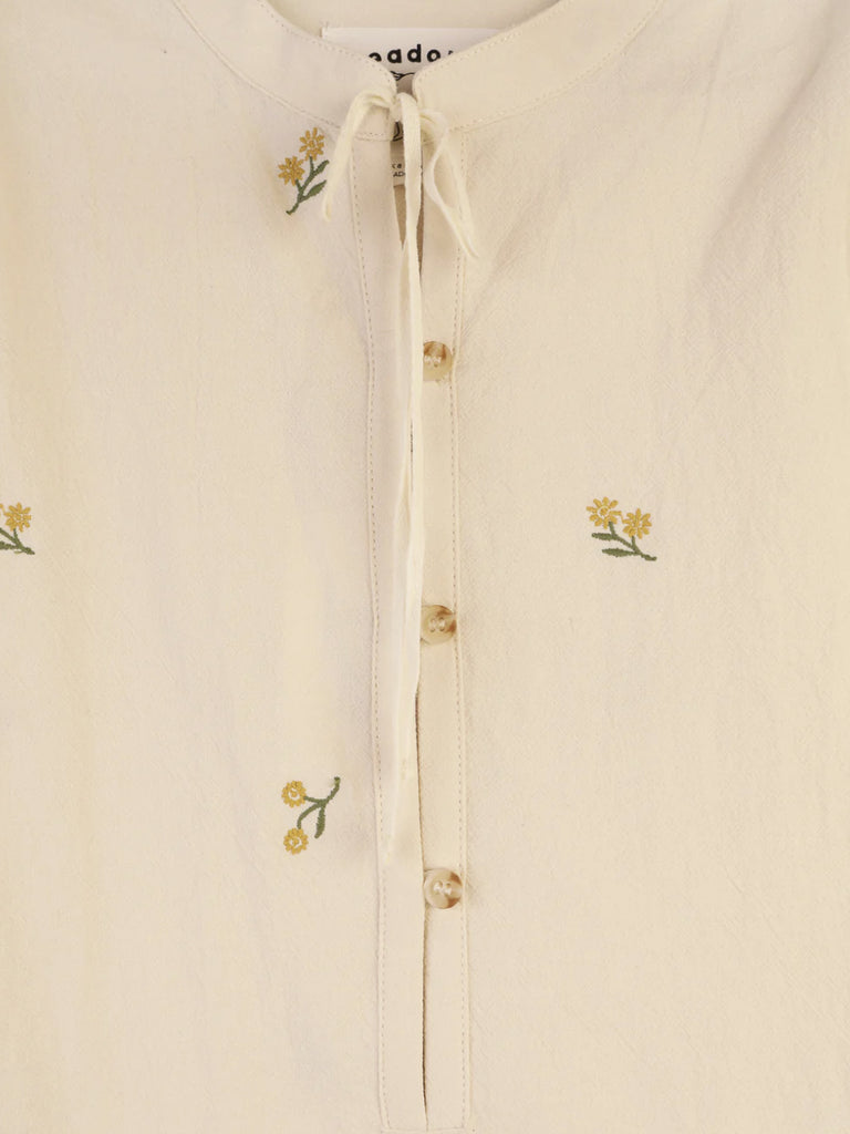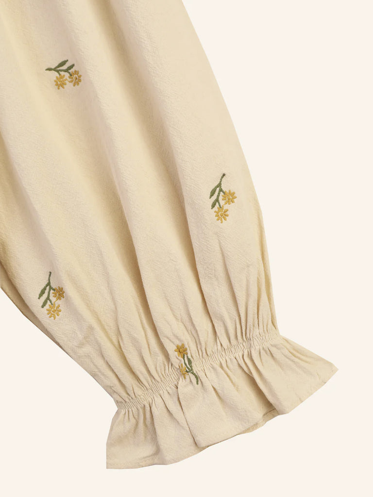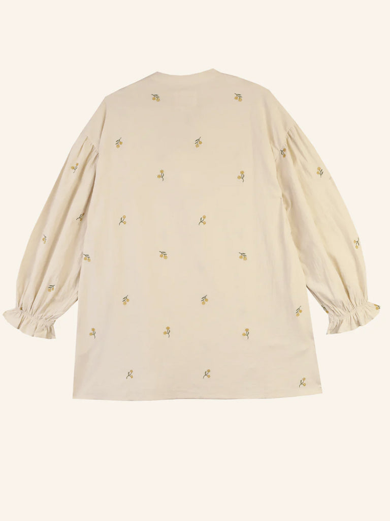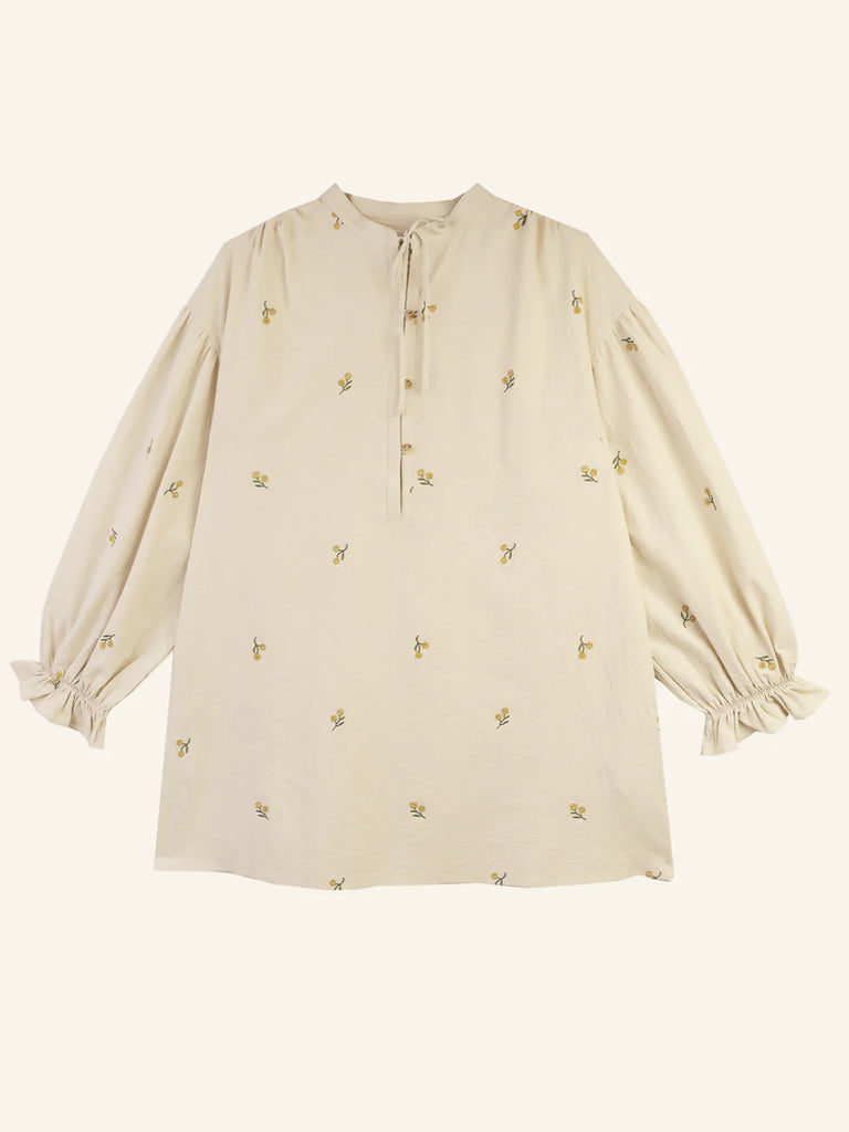 Oversized straight cut shirt with voluminous sleeves finished with an elasticated cuff, and a high round neckline fastened with a tie. In our limited Buttercup Embroidery print on an ecru cotton crepe base.