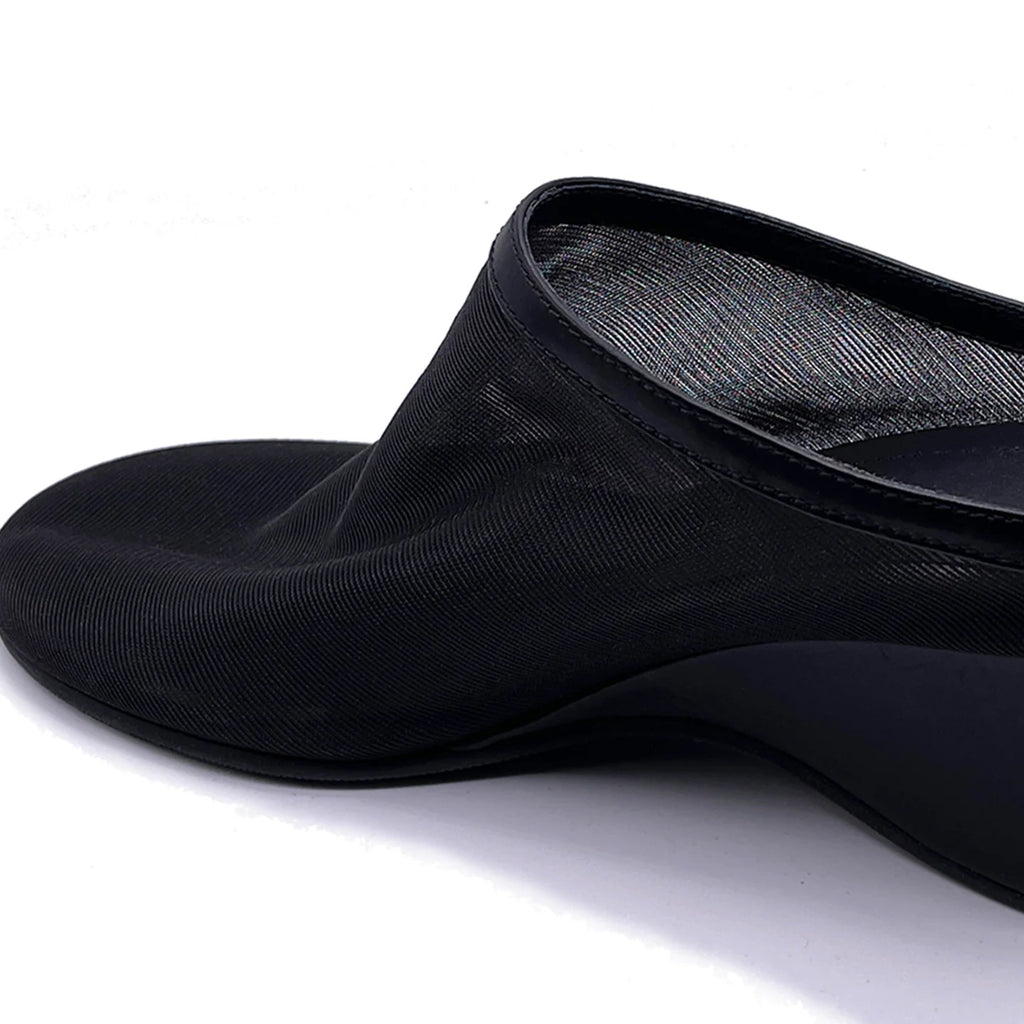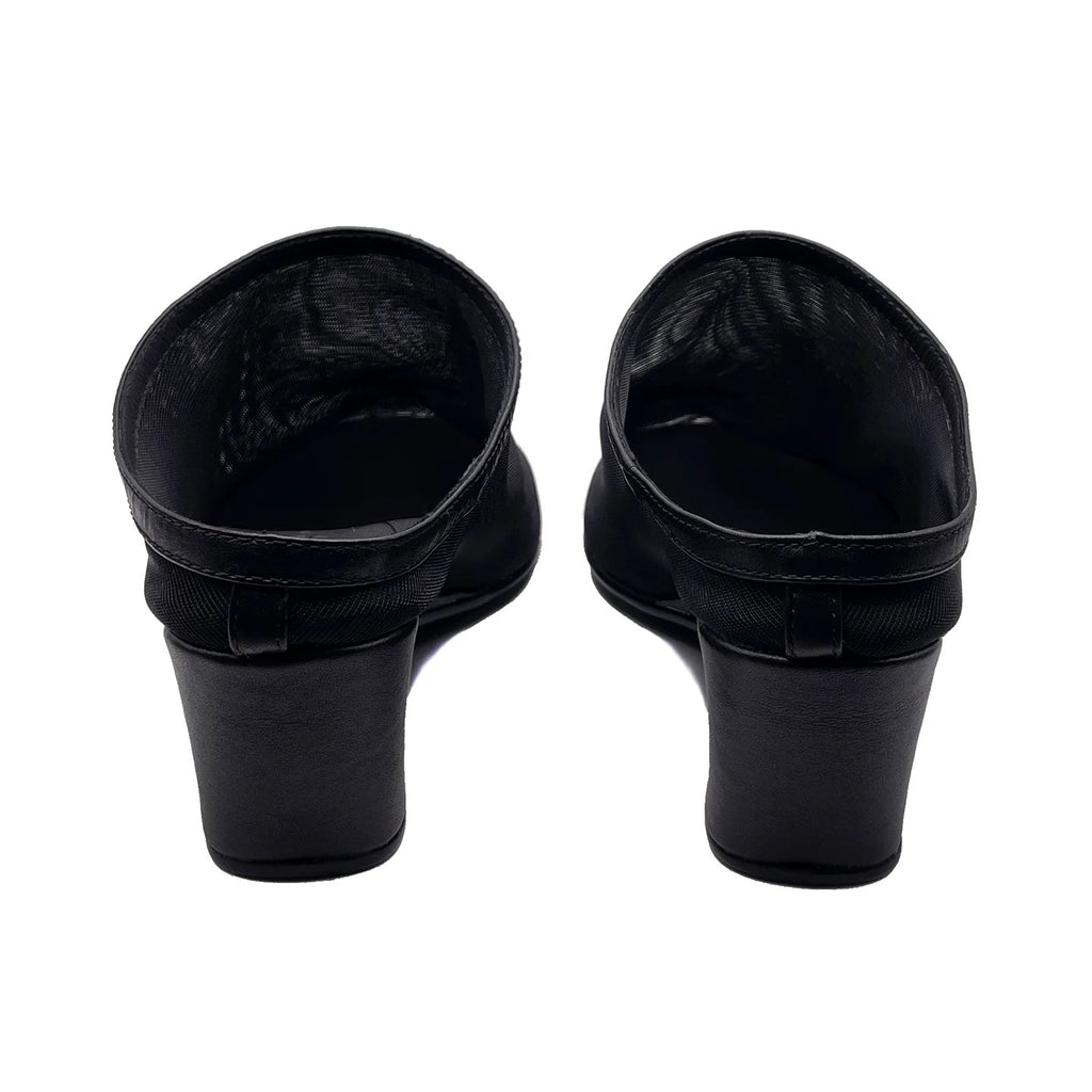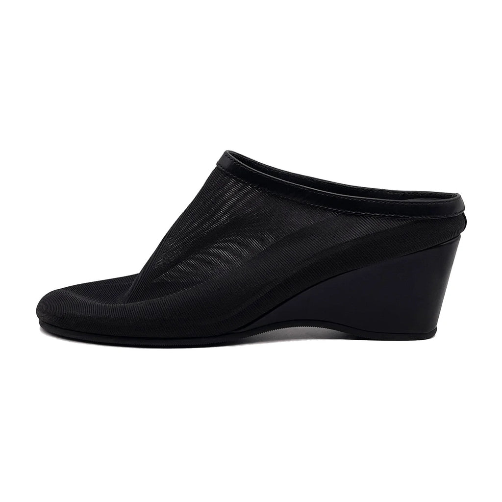 The Nana Mesh Mule is an ultra-lightweight, walkable day-to-night shoe that features a fine mesh upper with leather trim and a leather-covered low wedge heel. The breathable mesh upper is double-layered for a lightly sheer appearance and for a more secure fit.