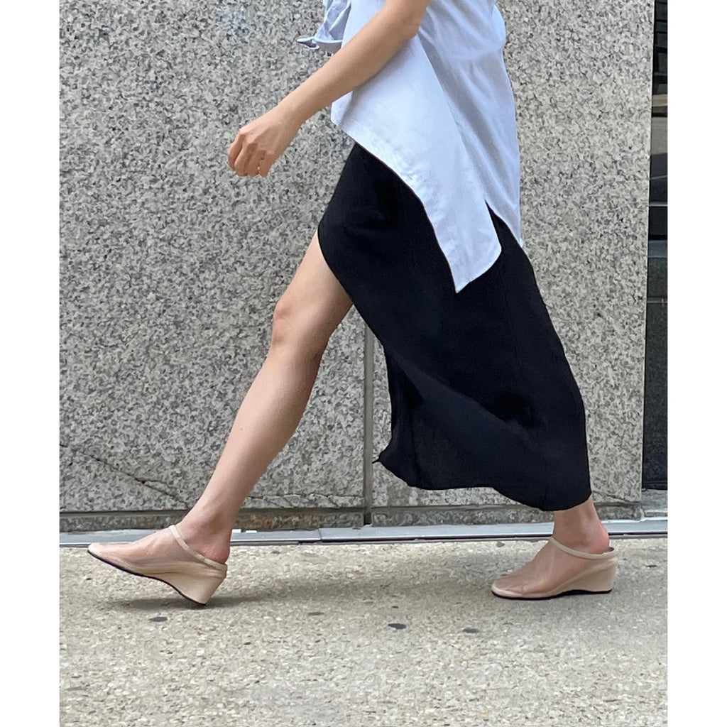 The Nana Mesh Mule is an ultra-lightweight, walkable day-to-night shoe that features a fine mesh upper with leather trim and a leather-covered low wedge heel. The breathable mesh upper is double-layered for a lightly sheer appearance and for a more secure fit.