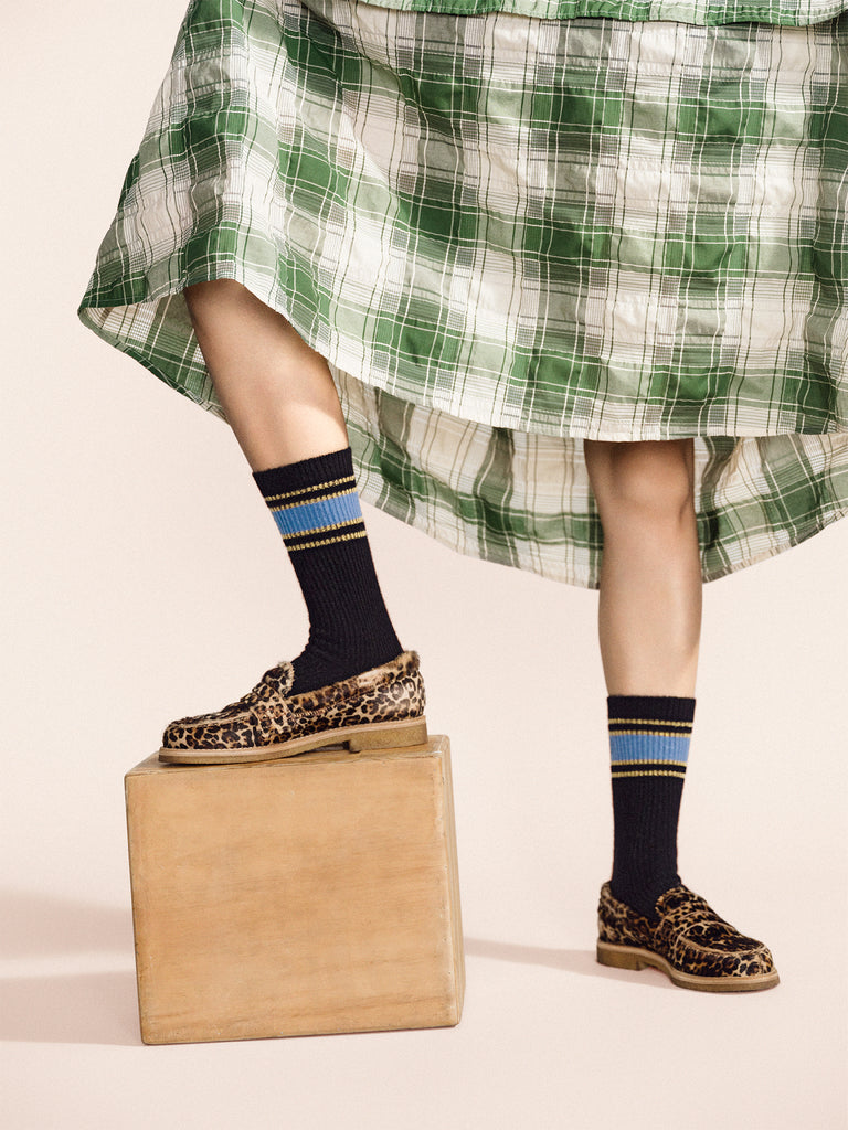 Hansel from Basel took a classic retro-sporty gym sock and gave it a glamorous makeover in supersoft cashmere. Try wearing them a little slouchy with loafers–it’s a vibe!