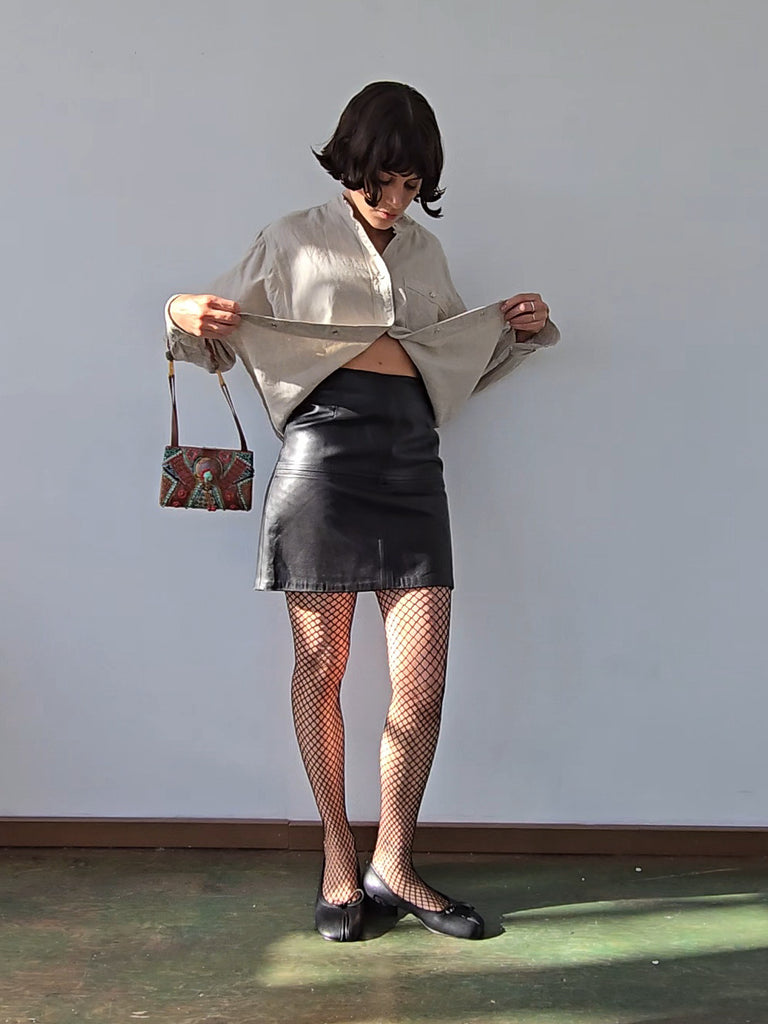 90s leather mini skirt, made in USA by Ann Taylor. Patched pieces with a zip up the back. Fully lined. Buttery soft and in great vintage shape.