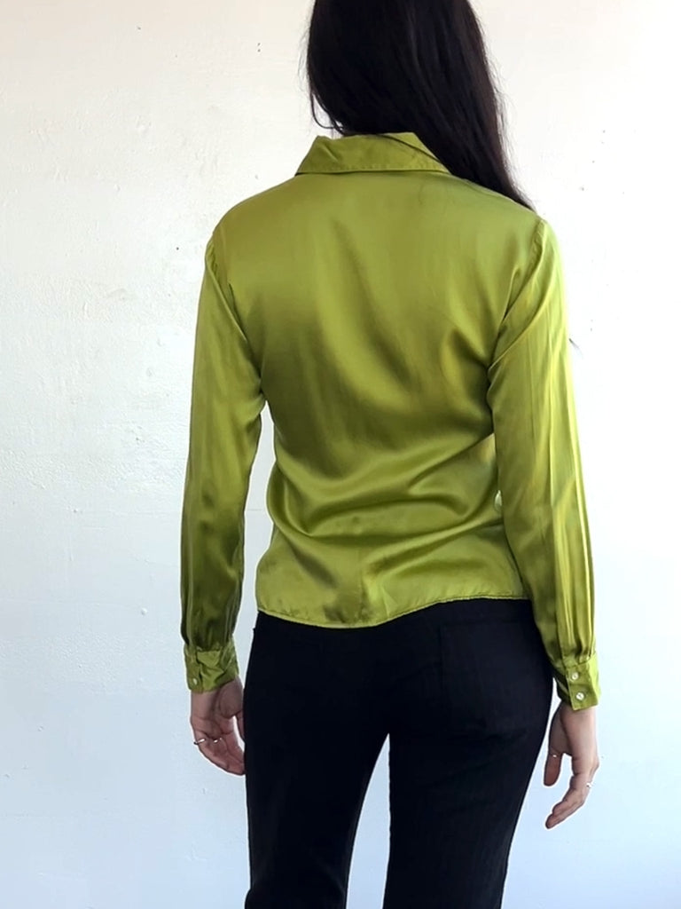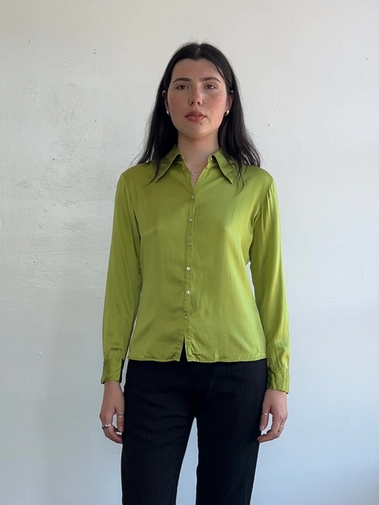Lime silk long sleeve button down with pointed collar and mother of pearl buttons. In good condition.