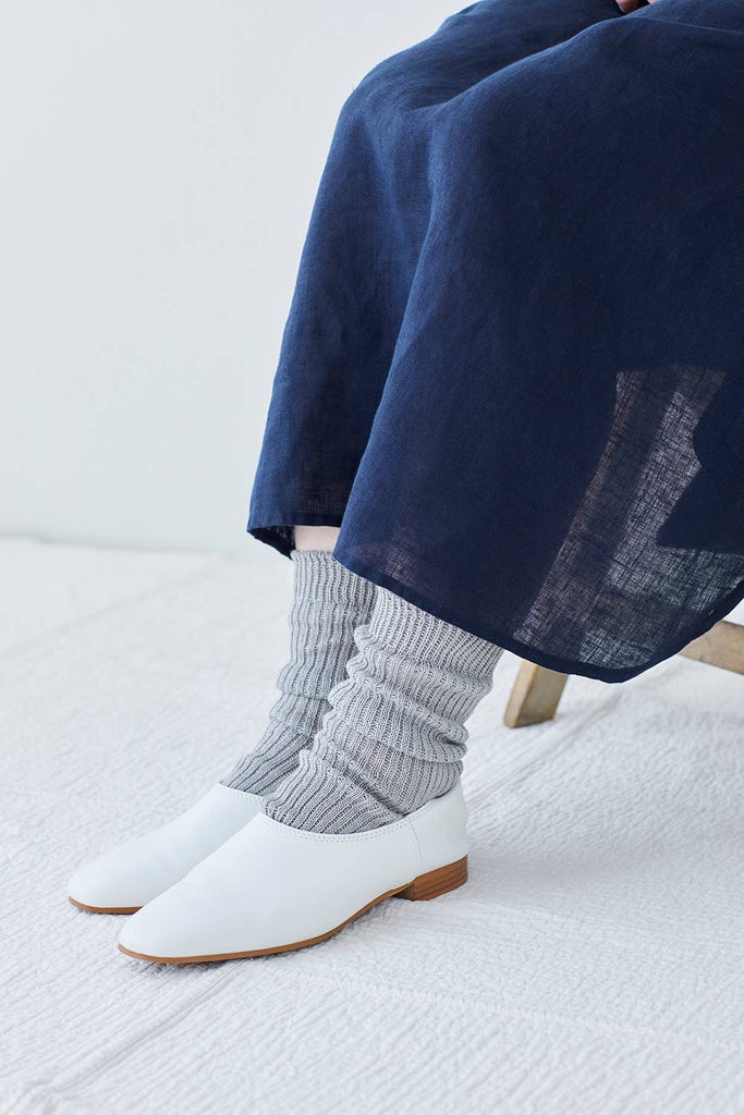A ribbed, crew length sock from Fog Linen. The natural linen content will keep your feet dry and cool, wicking away moisture. The length looks very cute with clogs and sandals.