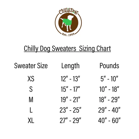The quality of Chilly Dog sweaters is superior to any other dog sweater, you will see the moment you hold it in your hand. Treat your dog to the best! For best sizing, check out the size chart!