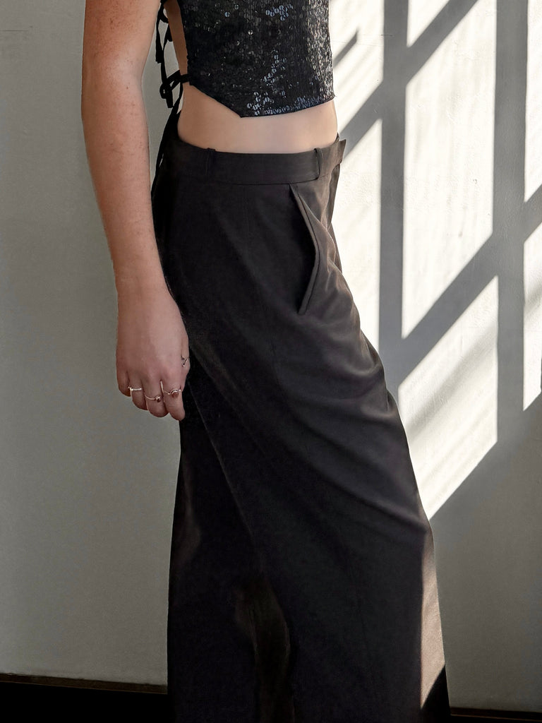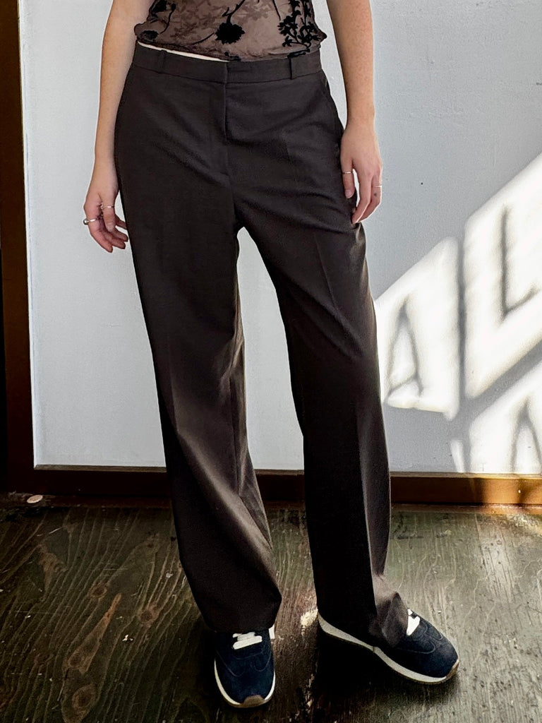 Beautiful dark brown heather classic straight leg wool trousers. Unlined with flat front, belt loops, side pockets and two welt back pockets. In excellent condition.
