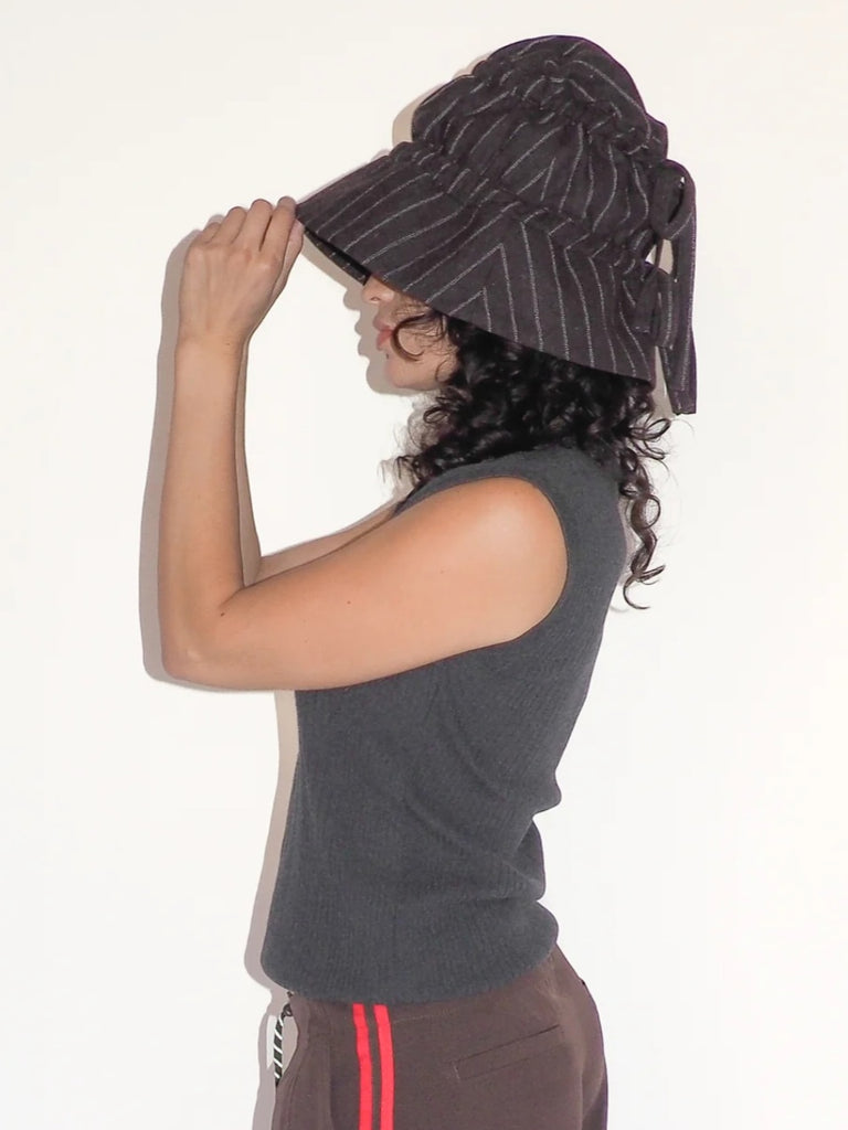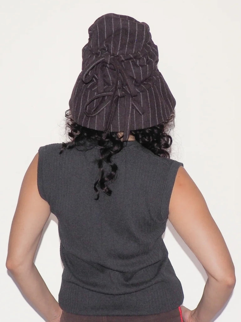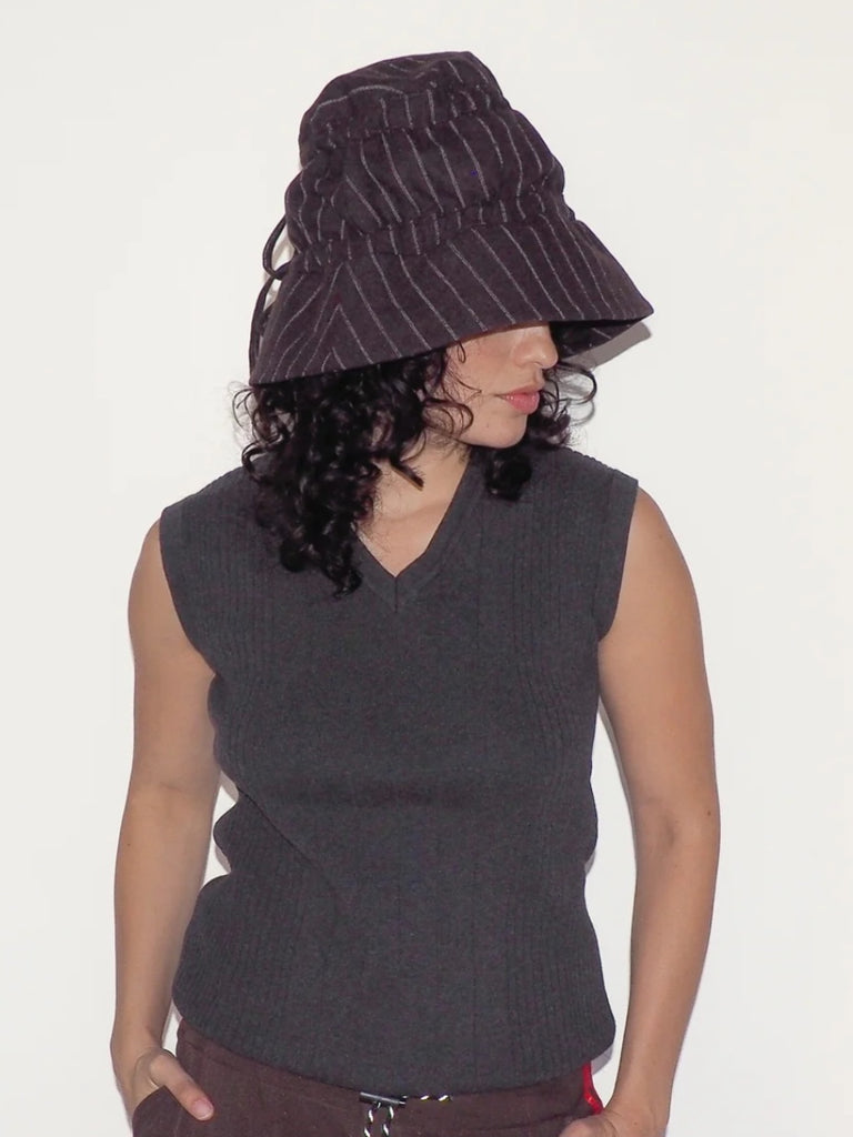 The Moth hat in soft wool pinstripe in brown, features an oversized shape and two drawstrings ties that can adjust the shape of the hat.