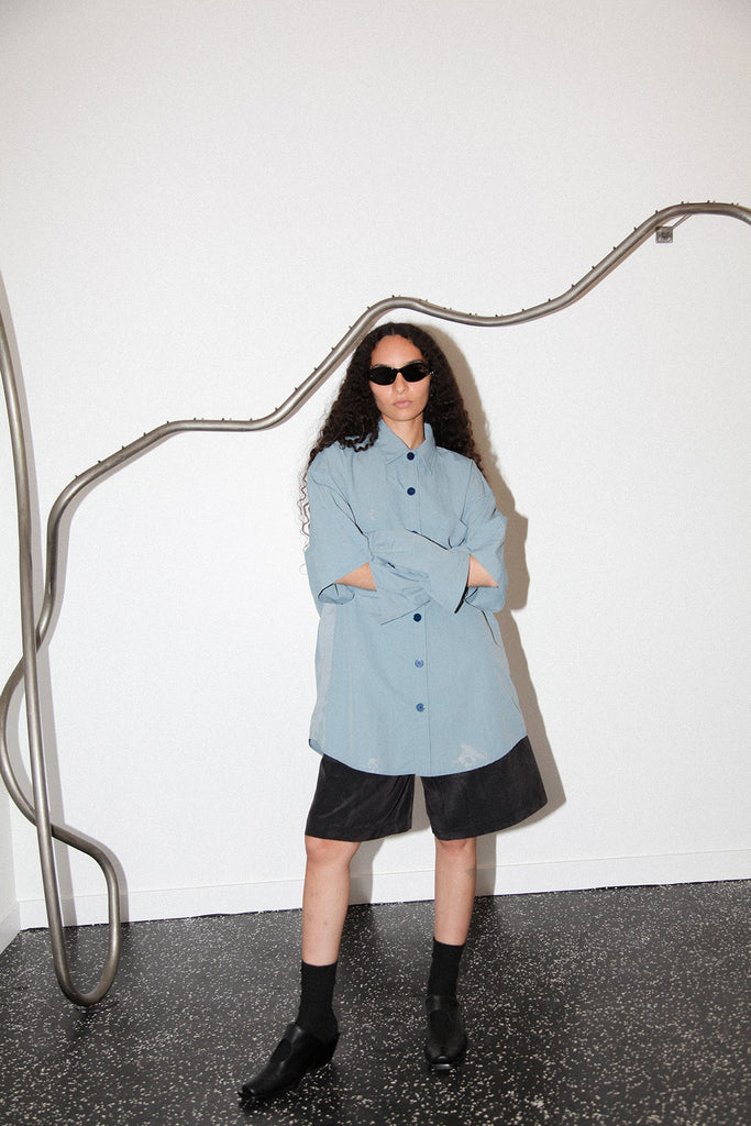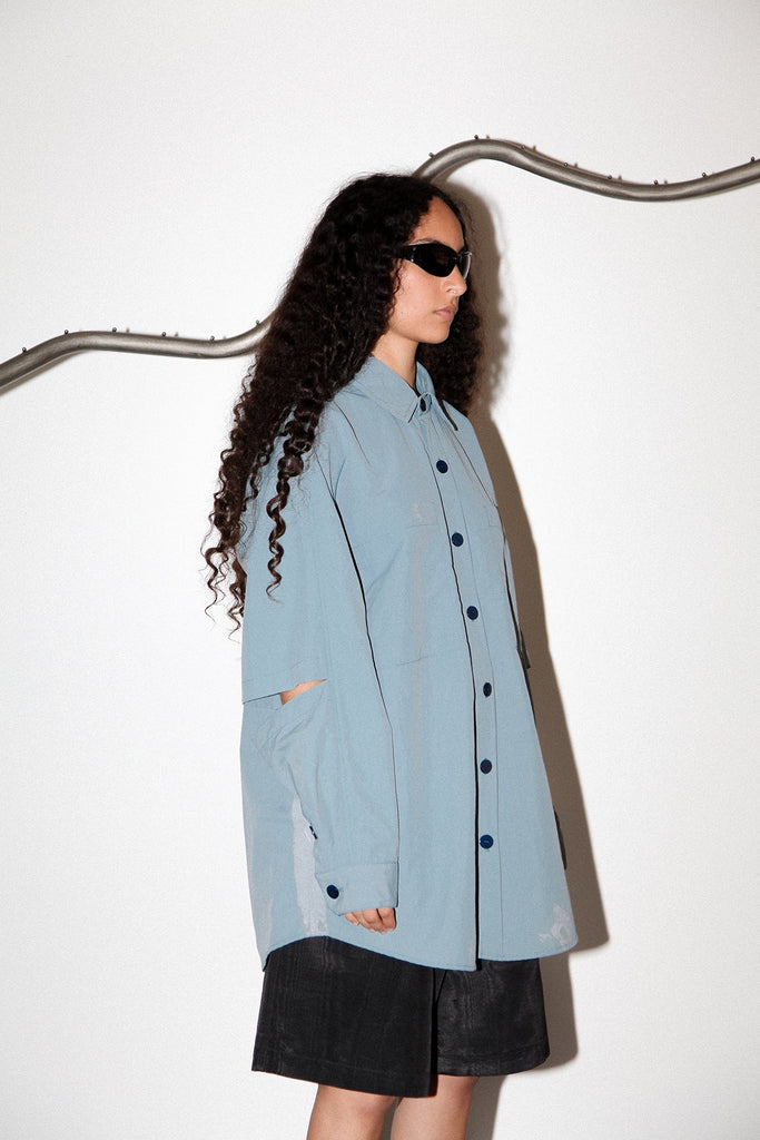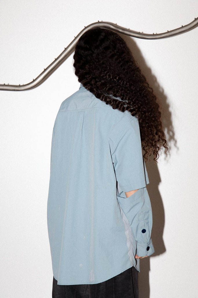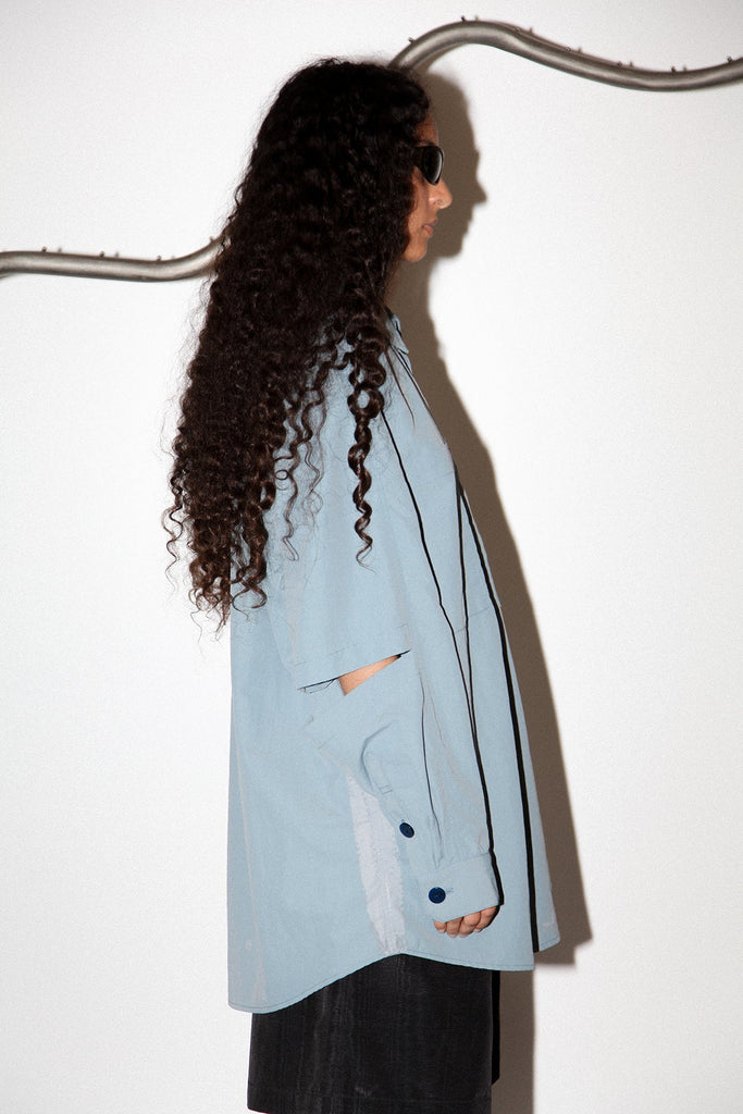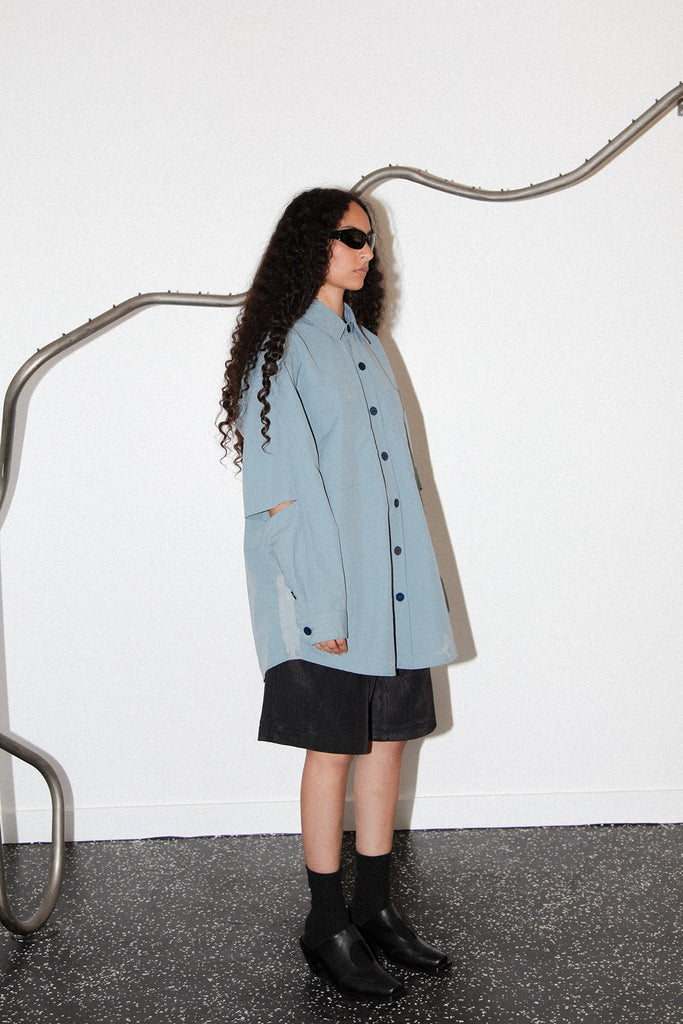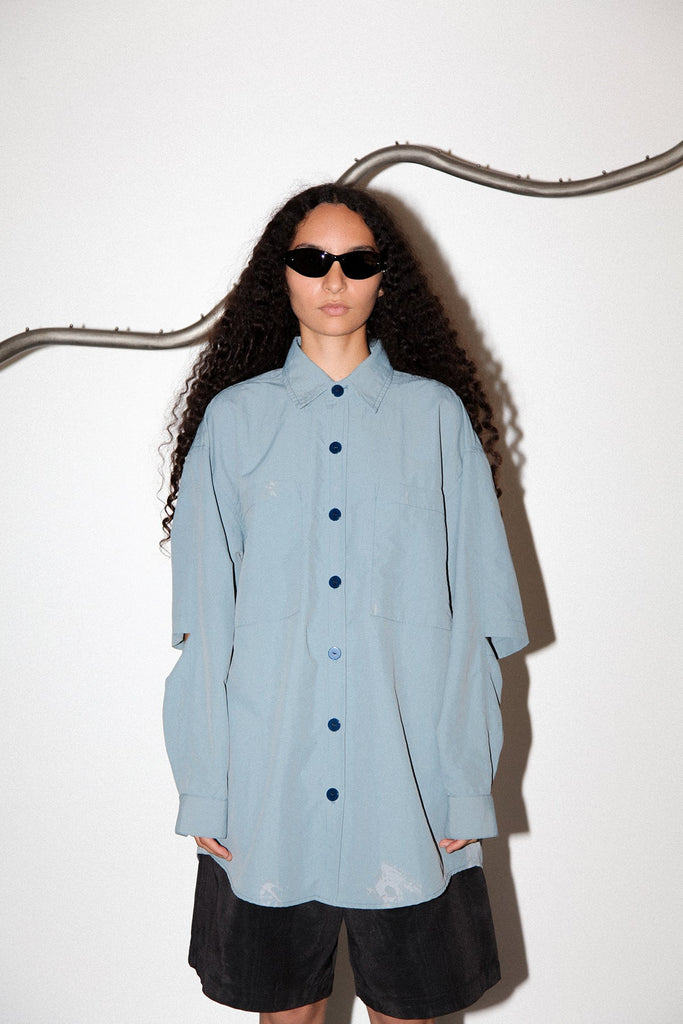 Everything shirt in a matte nylon with tonal hand-painted stripes at side seams / splatter. Perfect on it's own, worn layered or as a light outer layer. Oversized menswear fit with contrast lucite buttons, oversized chest pockets, and elbow slits.