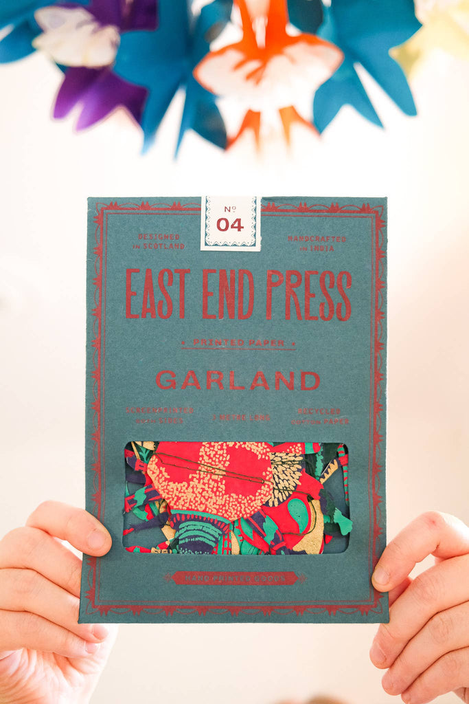 3 metres long - Includes 10 paper shapes, sewn along strong cotton thread - Screen printed by hand on both sides by talented artisans in Jaipur - Sustainably made from recycled materials