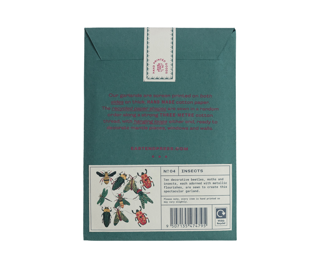 Ten decorative beetles, moths and insects, each adorned with metallic flourishes, are sewn to create this spectacular garland. One of our all time best sellers!