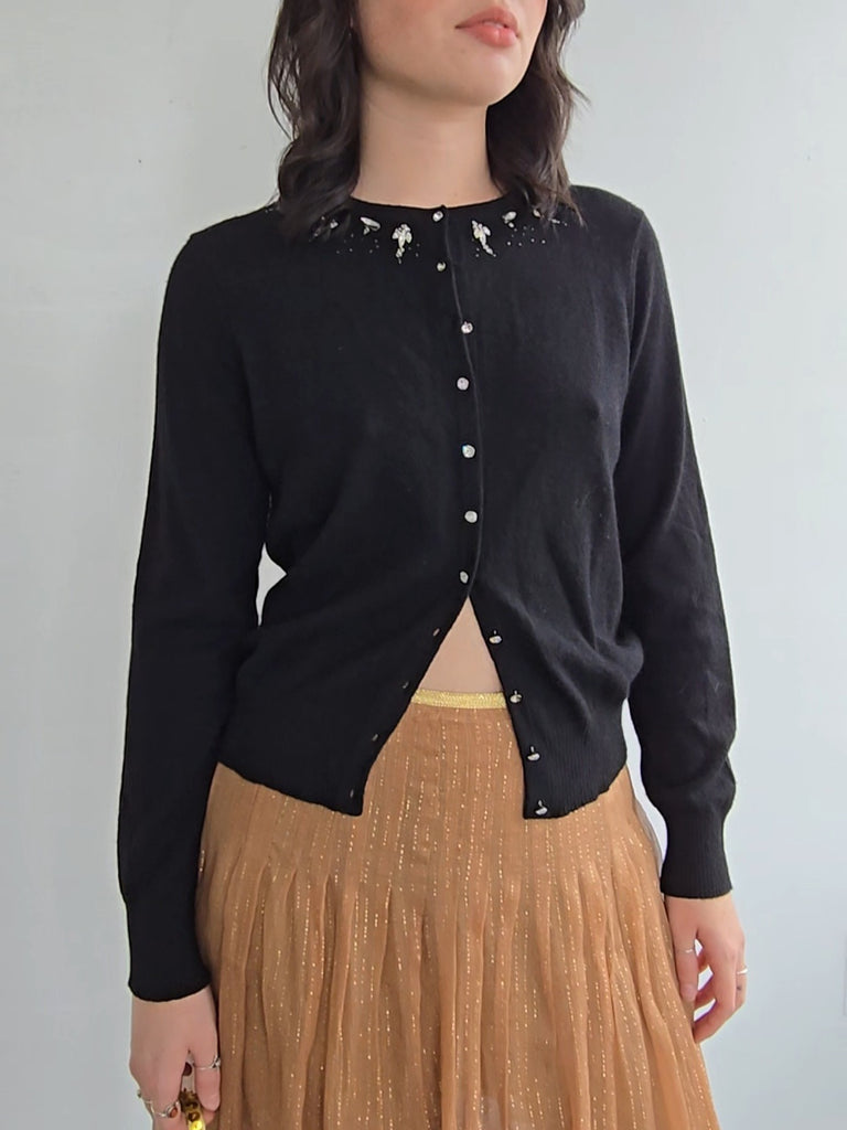 Black 2-Ply Cashmere Rhinestoned Cardi