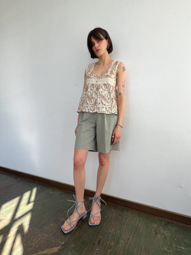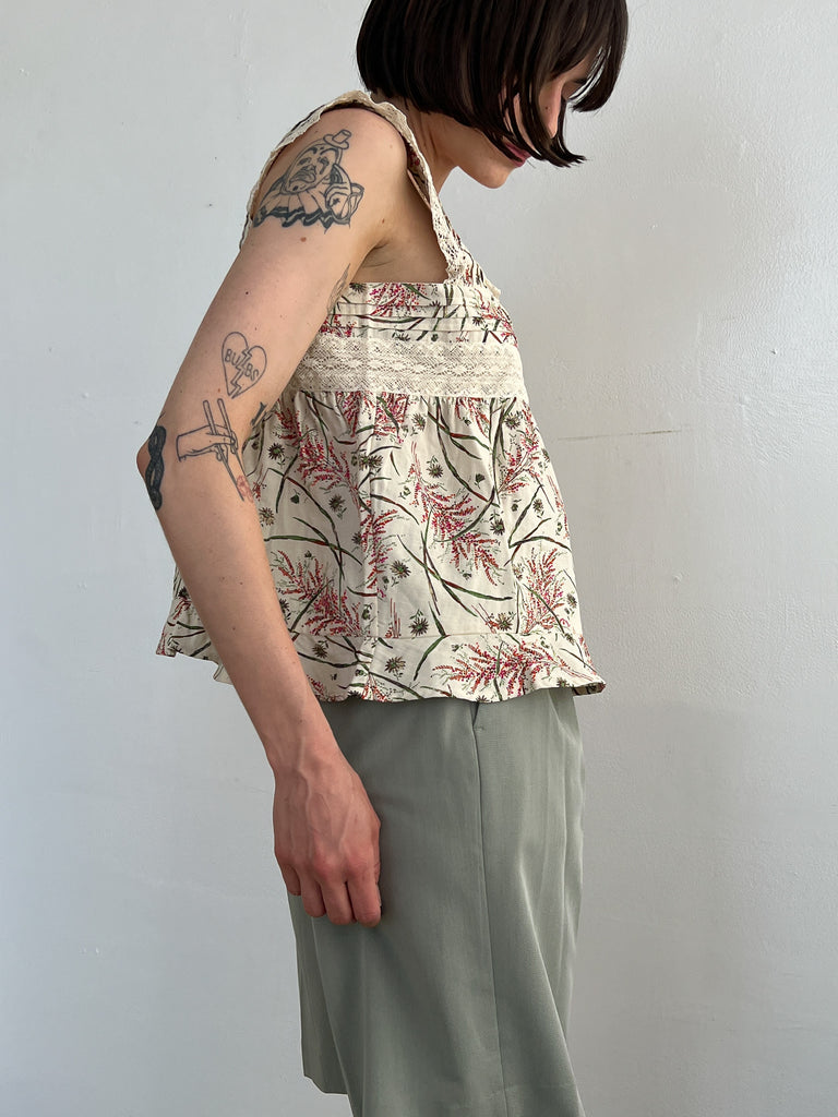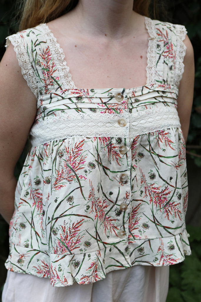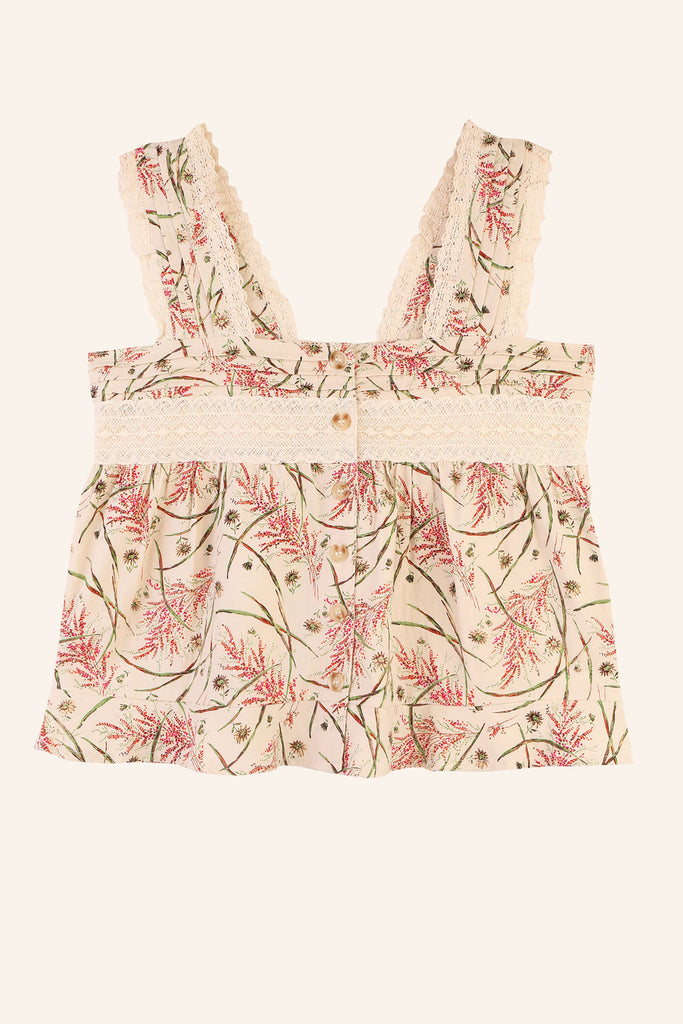 The Francoa Top has a cropped square shape, with tortoiseshell buttons down the front and thick lace straps. In limited Wheat Floral print.