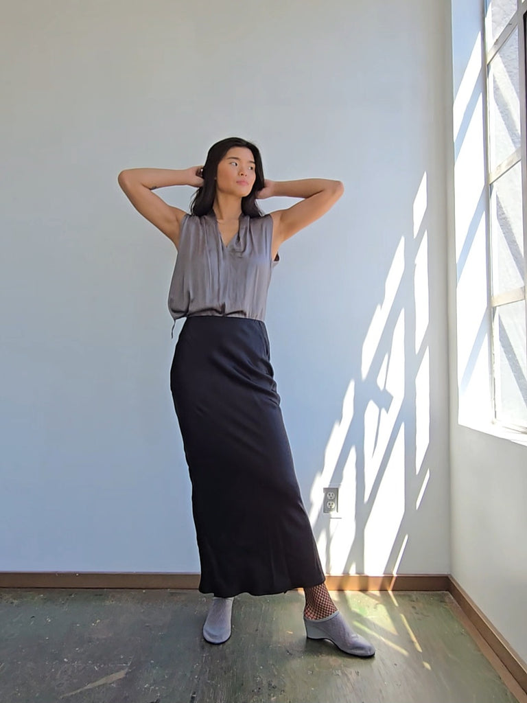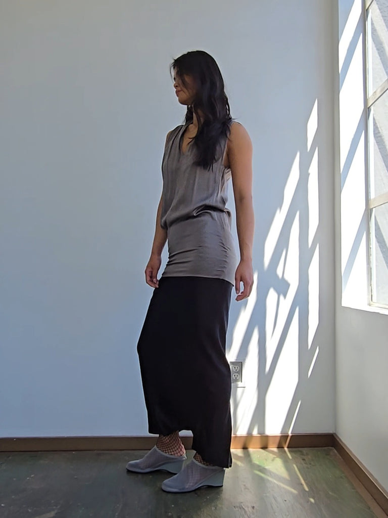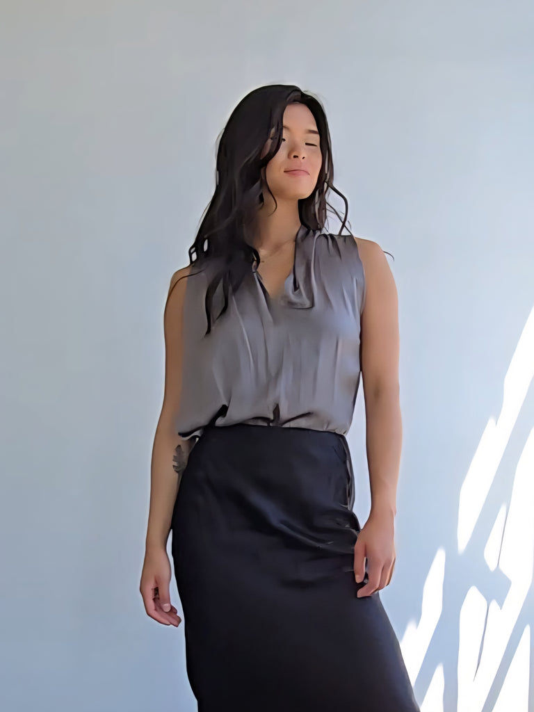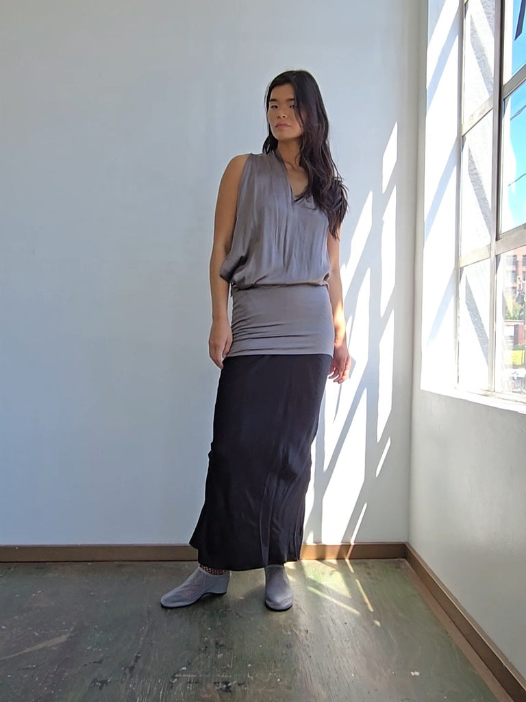 Ilaria Nistri grey silk charmuese sleeveless minidress with asymmetric drop waist that flares to the side and reveals an opening on the side body that ties closed under the arm. In great condition. Marked size 40.