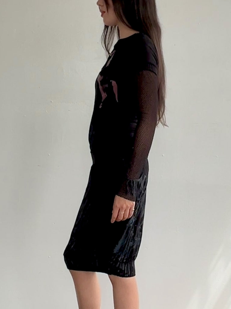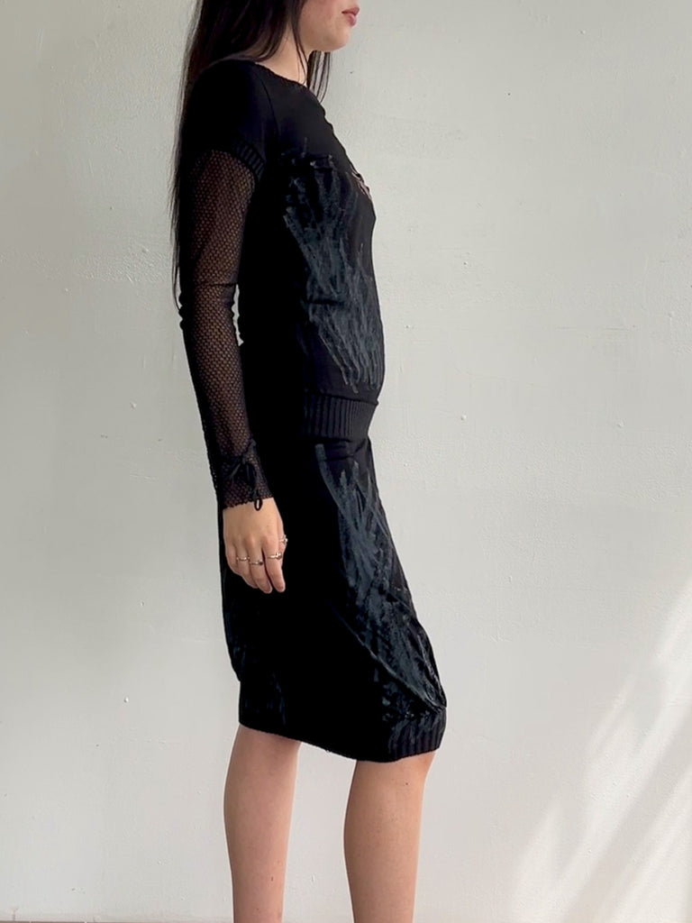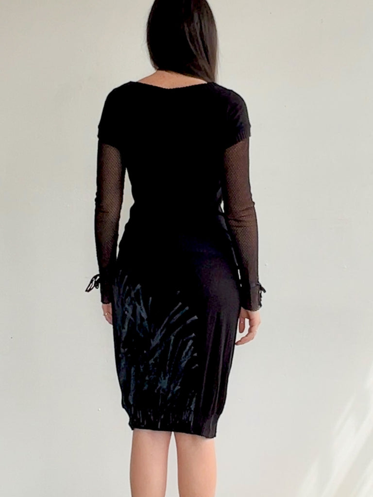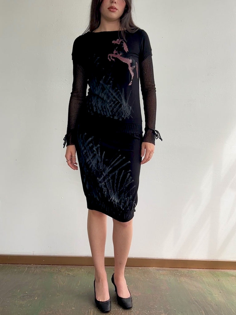 Italian-made deconstructed dress with sparkly maroon horse printed across the chest and abstract paint marks throughout the piece. Dress has a rib knit neckline, along with a stretchy rib knit dropwaist and hemline. Sleeves are long and made with a black lace that are tied at the wrist with a small black bow. In good condition.