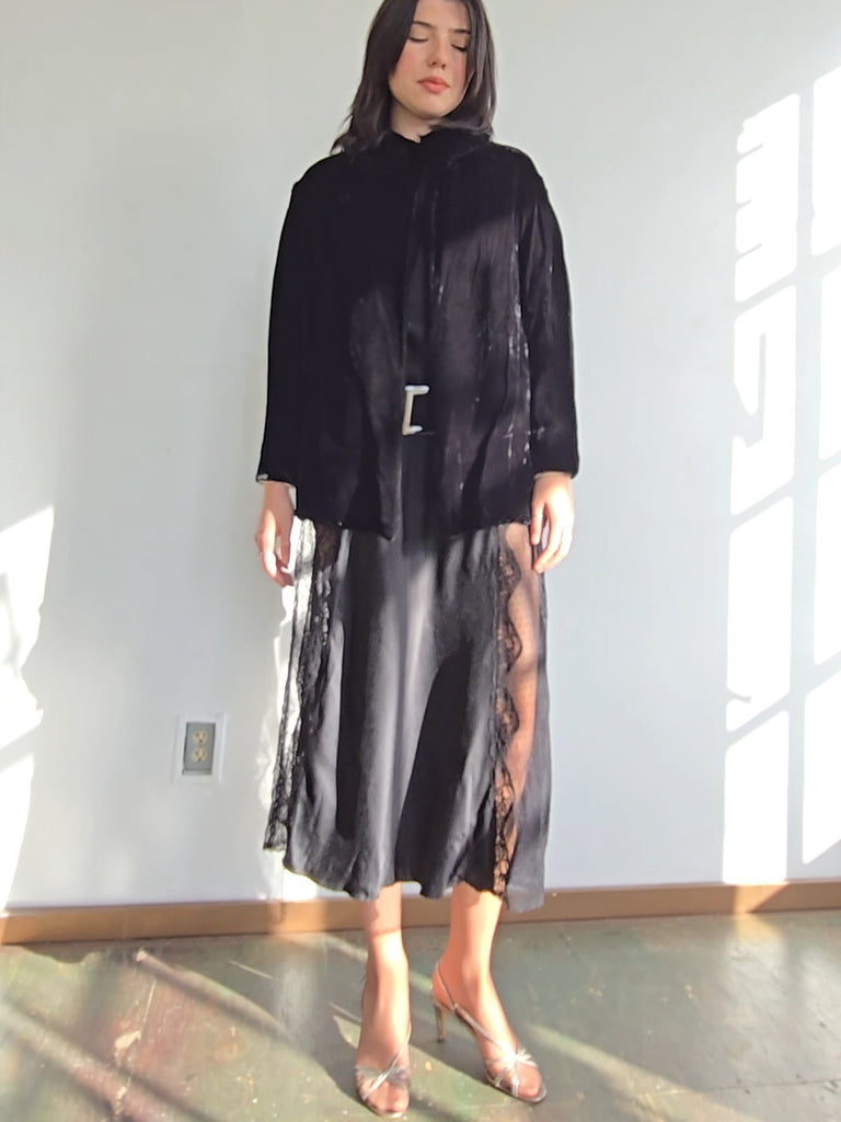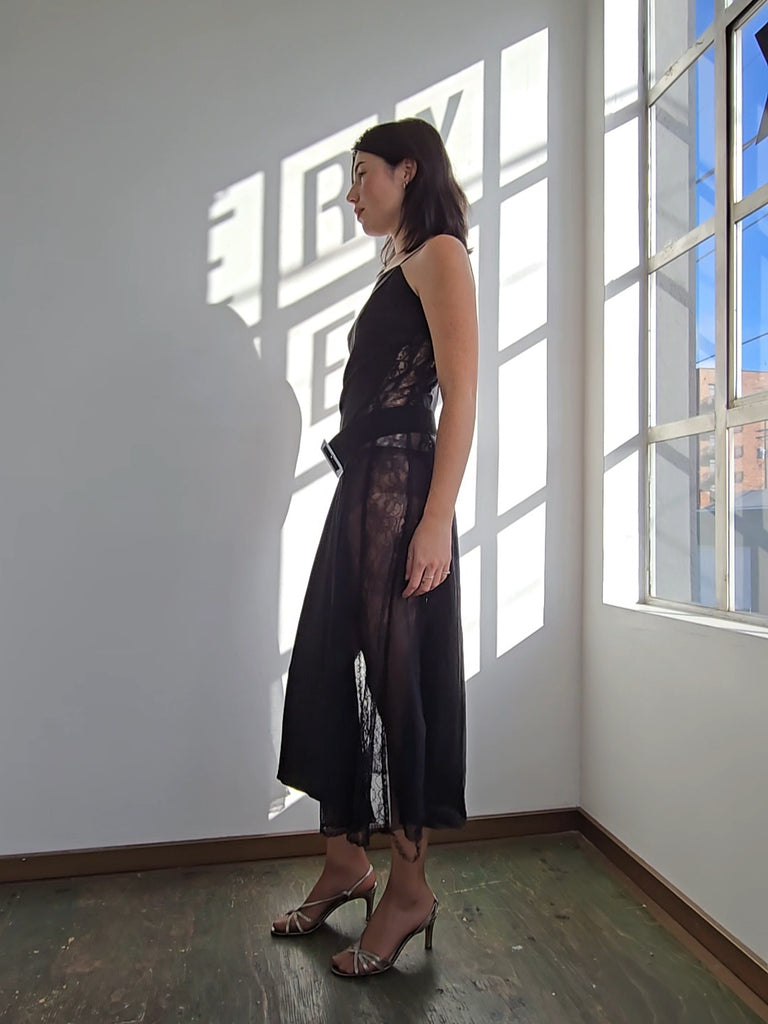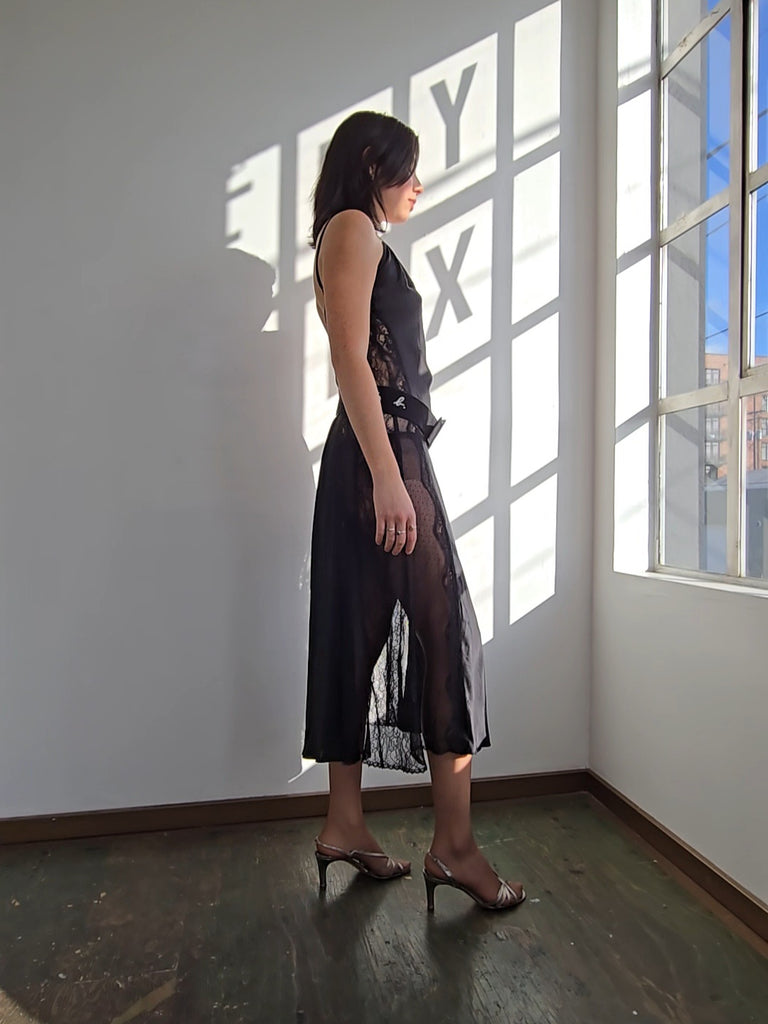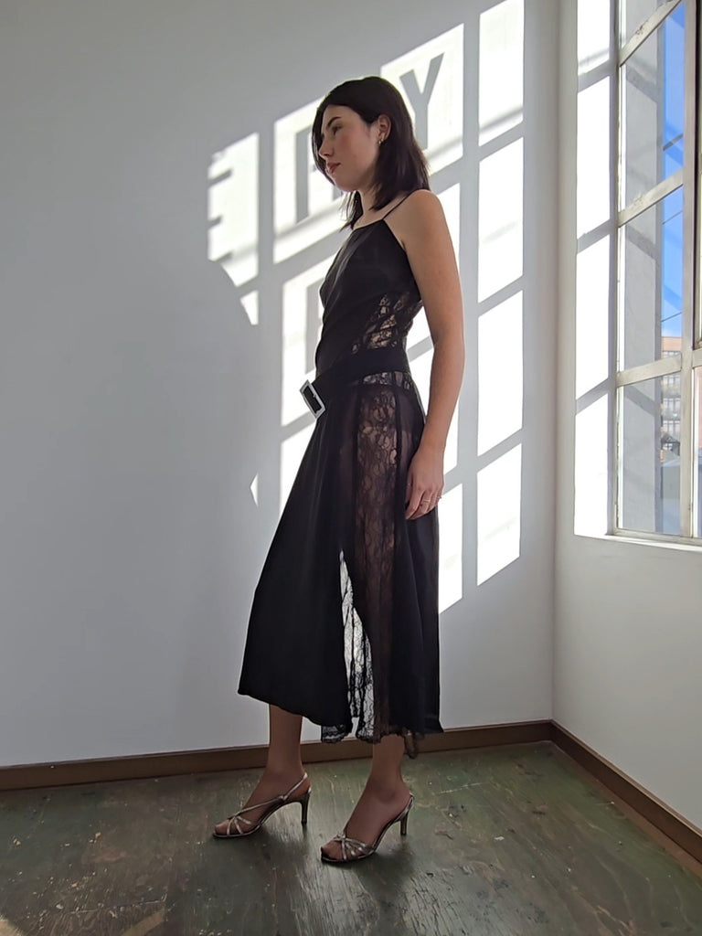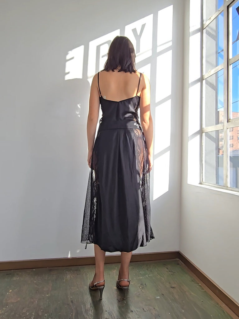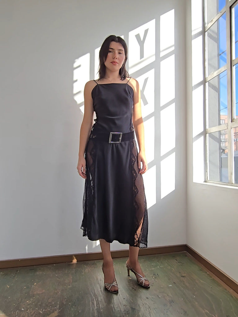 Vintage Victoria's Secret black silk charmuese long slipdress with lace cutouts on the sides. Adjustable straps. Excellent condition.Marked size M.